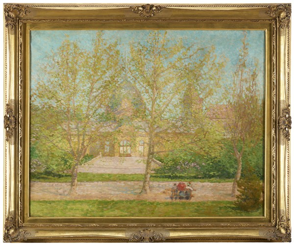 Ignoto postimpressionista "Scorcio con palazzo e figure" olio su tela (cm 77x