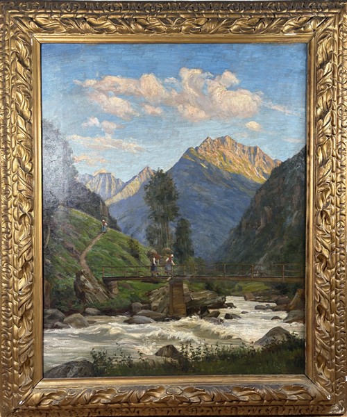 Lotto 39 | Giovanni Rava "Fienaiole attraversano un ponte" 1911 olio su tela (cm 100x80) fi