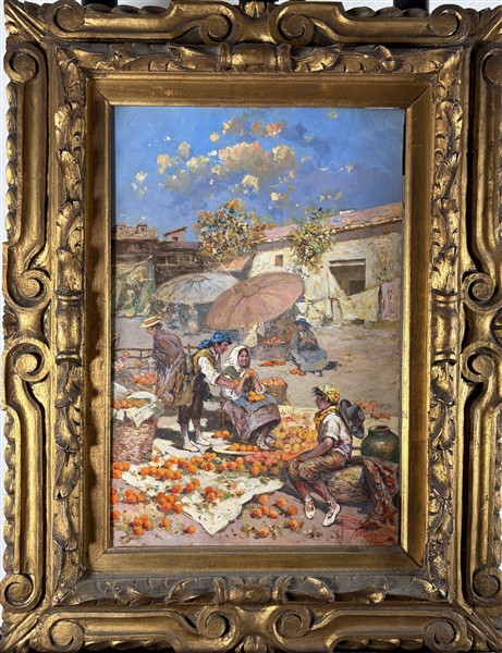 Riccardo Pellegrini "Venditori d'arance" olio su cartone (cm 45x30) firmato in