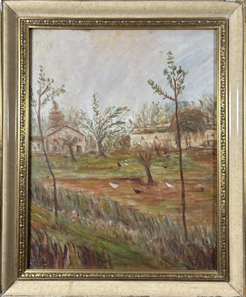 Edoardo Gordigiani "Cortile con galline" olio su tela libera (cm 48x36) firmato