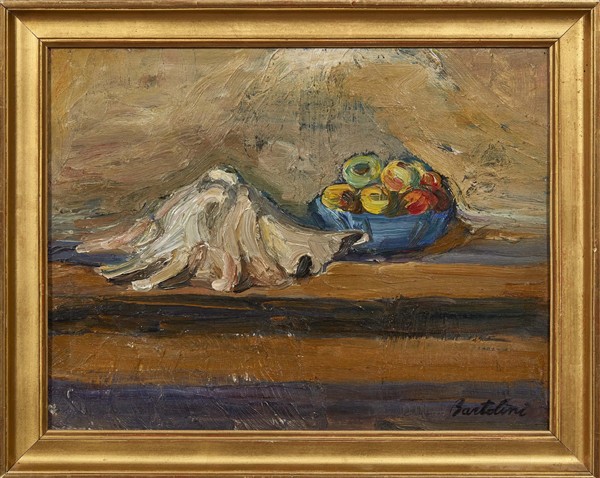 Luigi Bartolini "Natura morta con conchiglia e mele" olio su compensato (cm 33x
