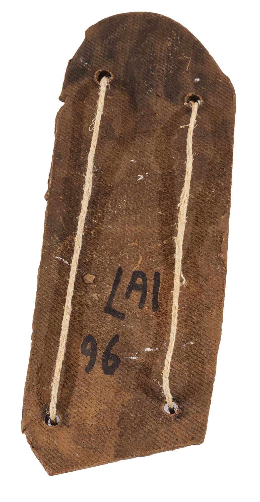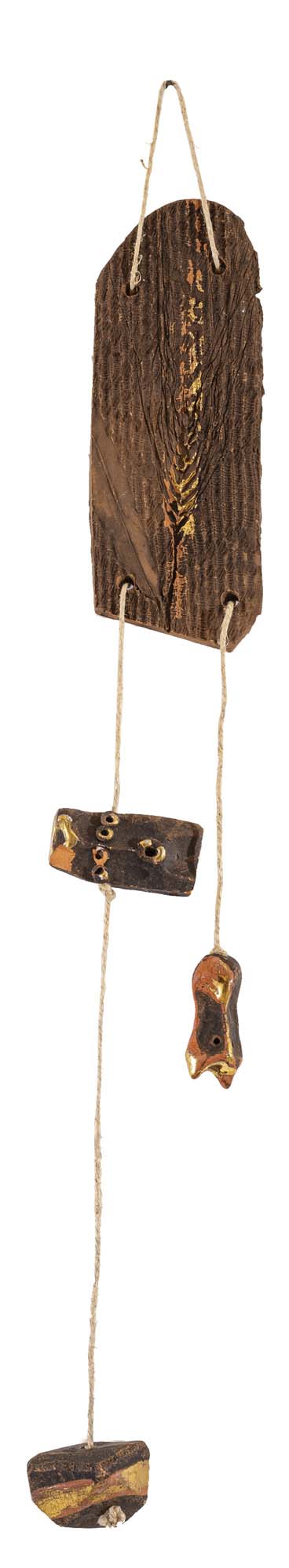terracotta smaltata, foglia oro e spago h. cm. 58; tavoletta cm. 16x7