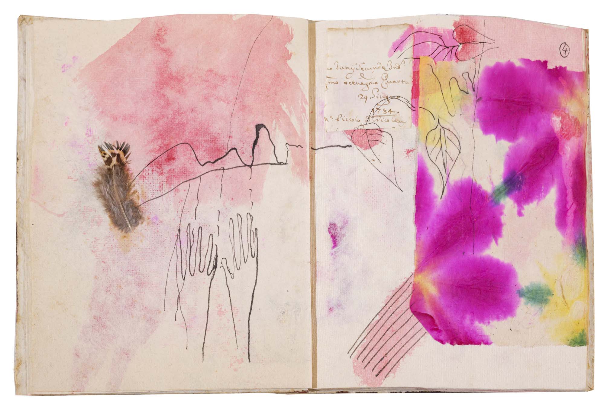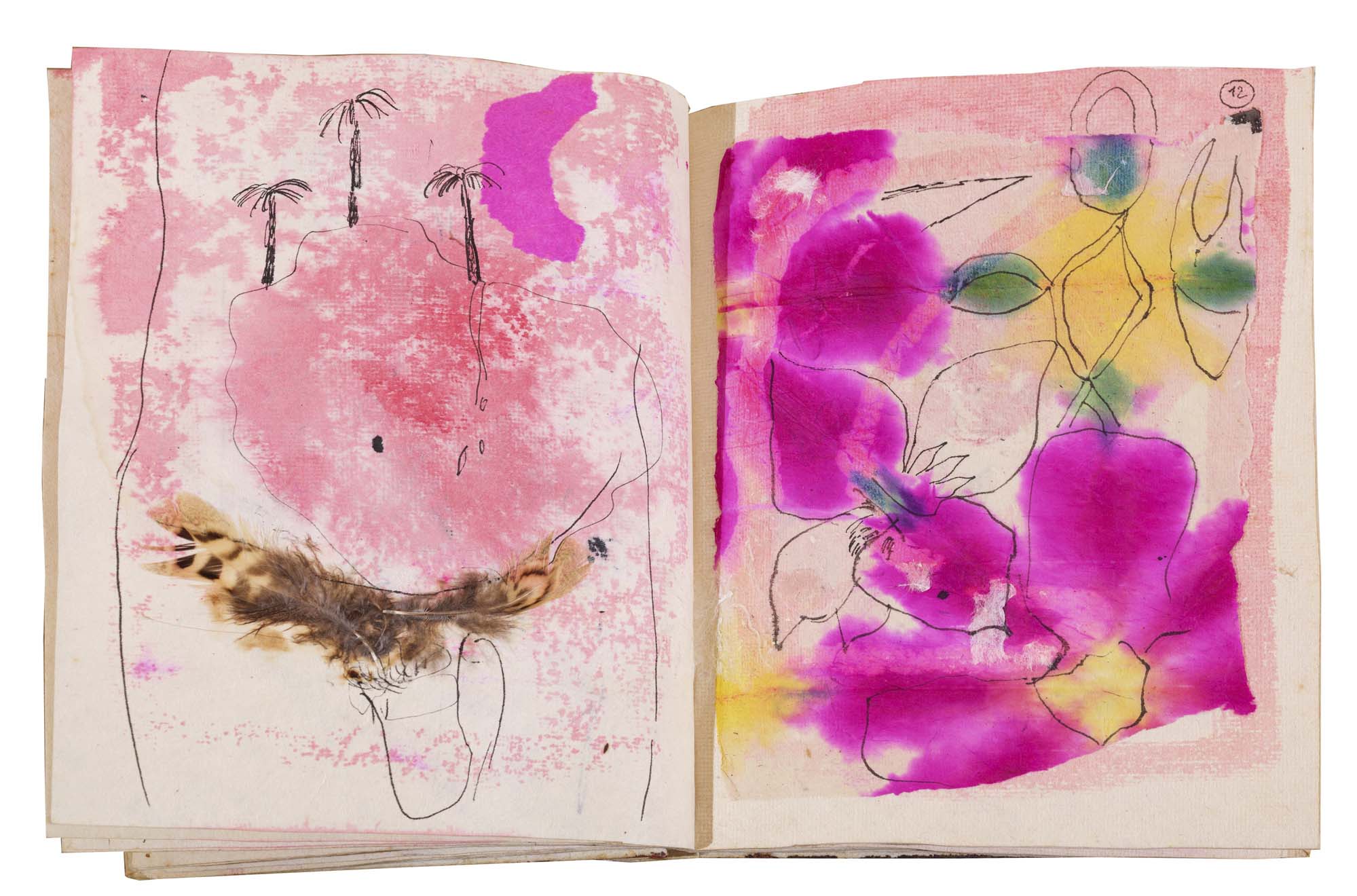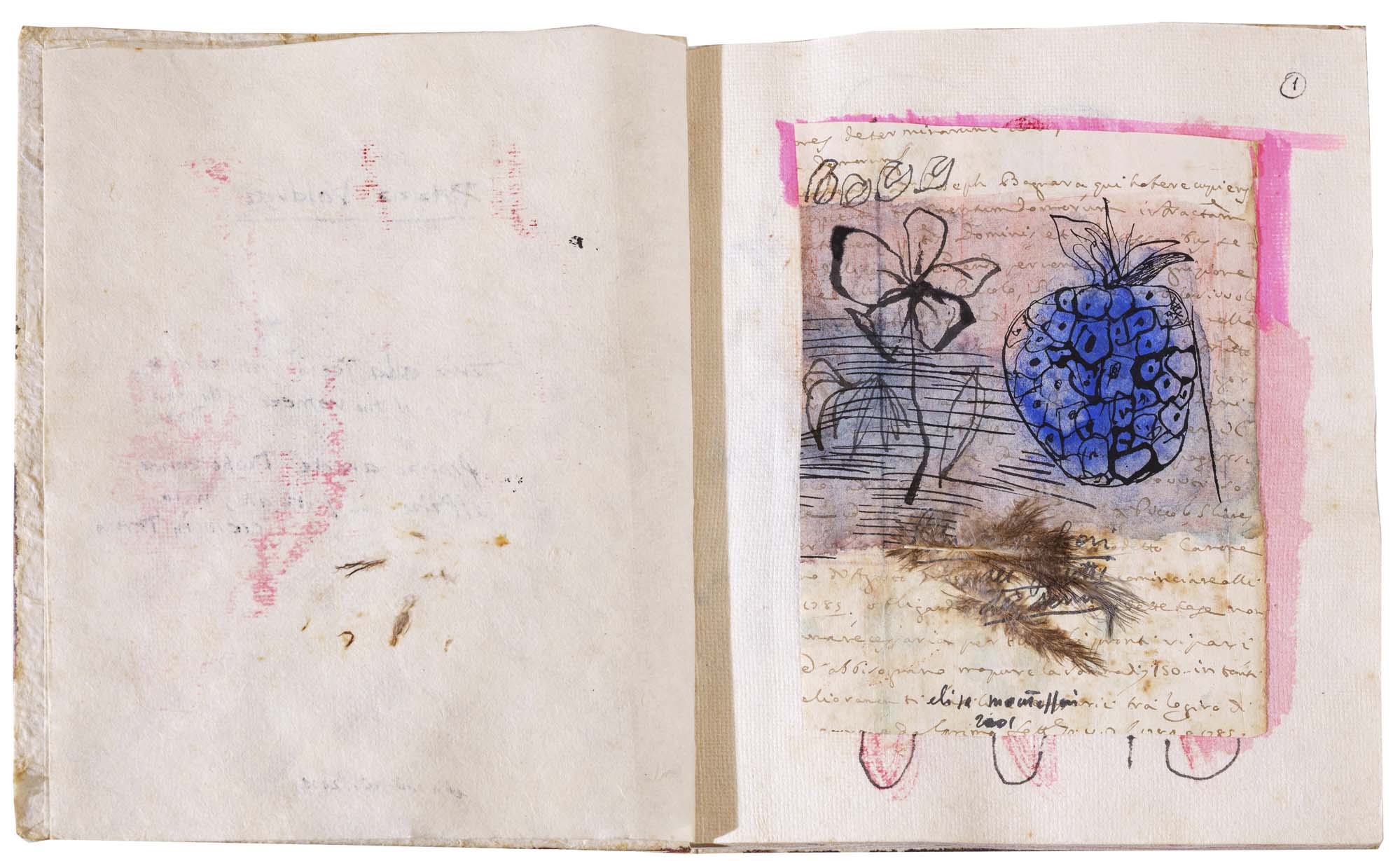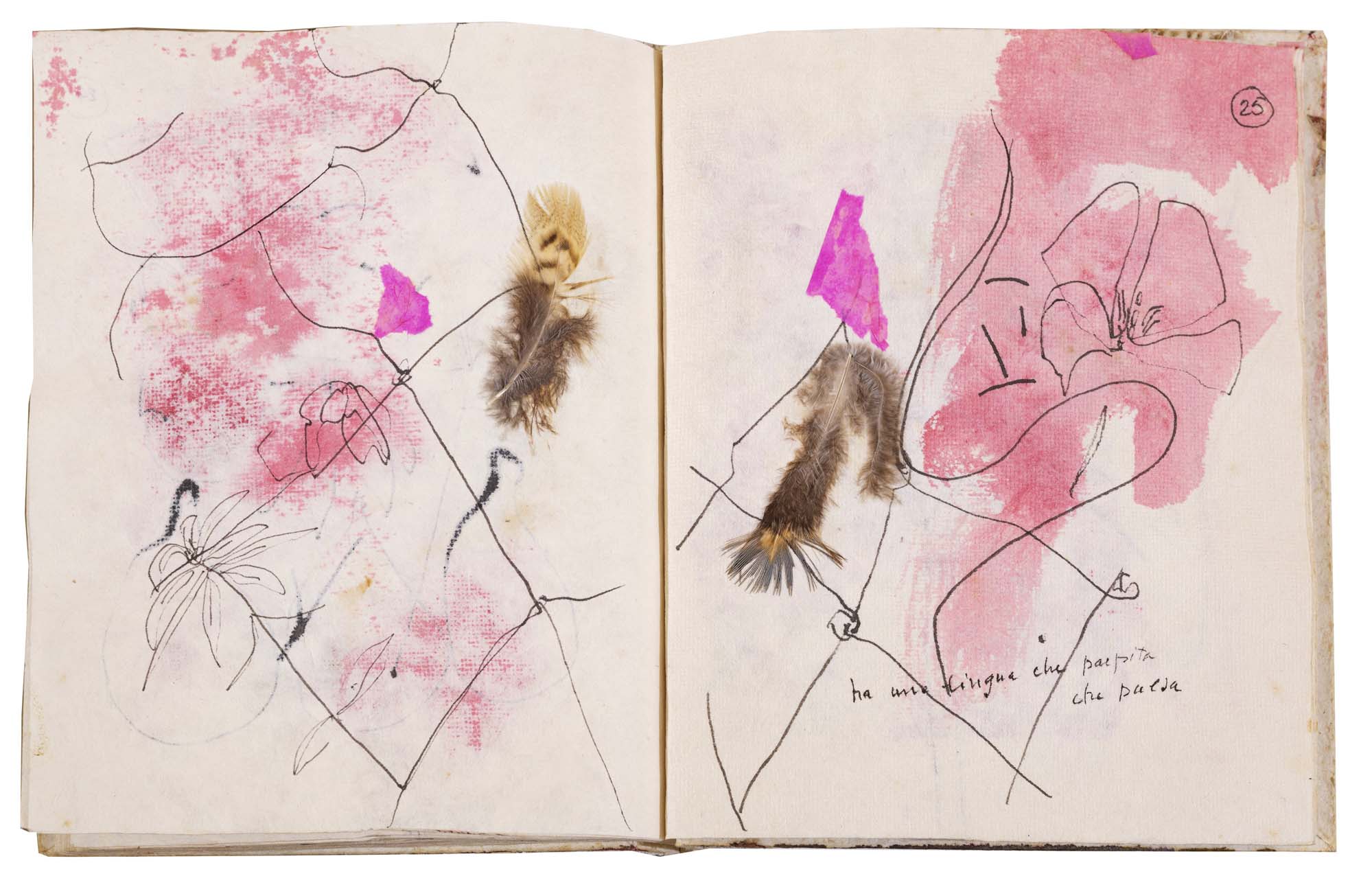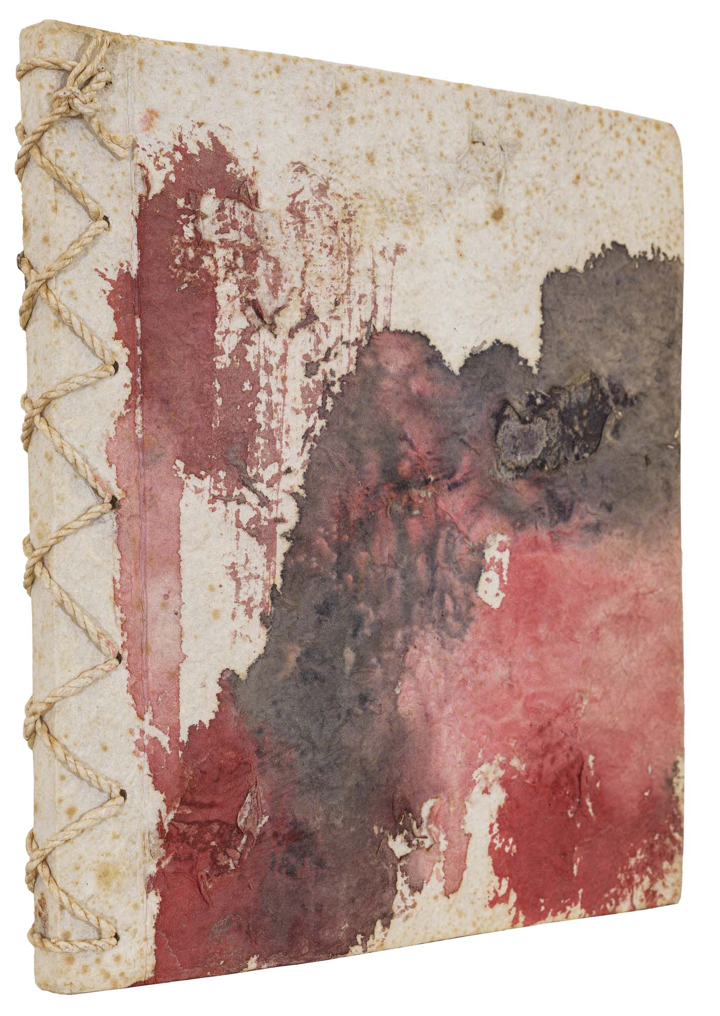 libro rilegato contenente 29 tecniche miste su carta a mano (dipinte entrambe le facciate) cm. 24,5x19 (fogli) - 25,5x23x2 (libro)