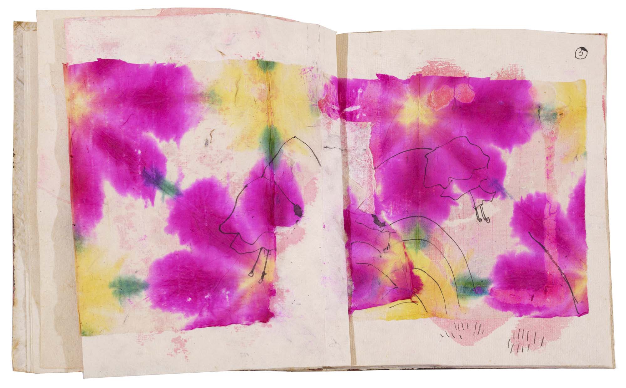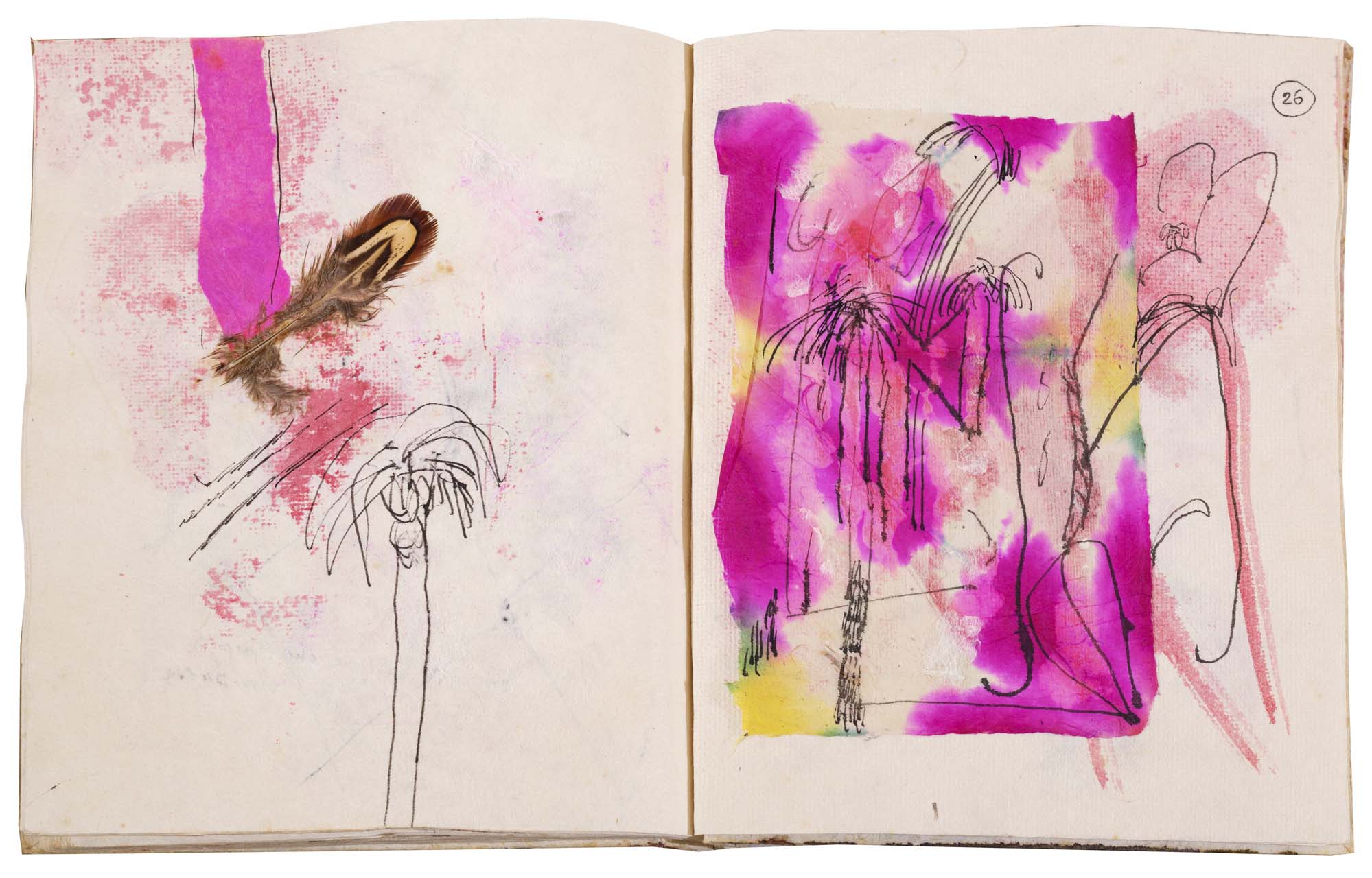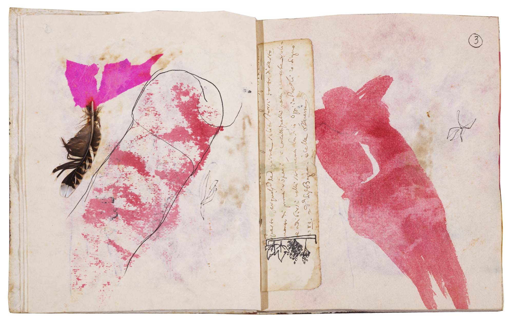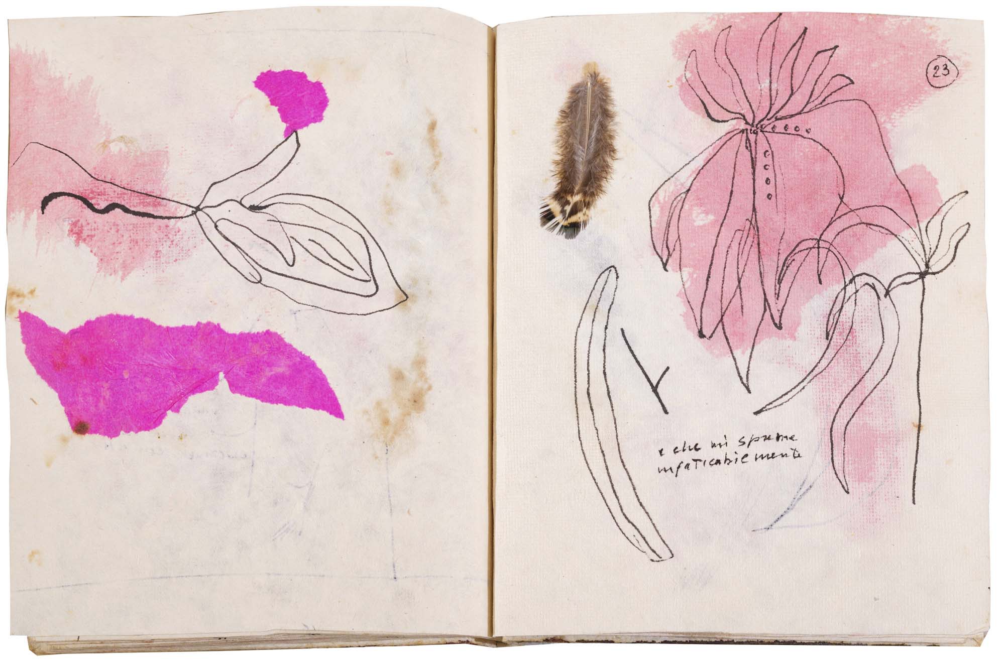 libro rilegato contenente 29 tecniche miste su carta a mano (dipinte entrambe le facciate) cm. 24,5x19 (fogli) - 25,5x23x2 (libro)