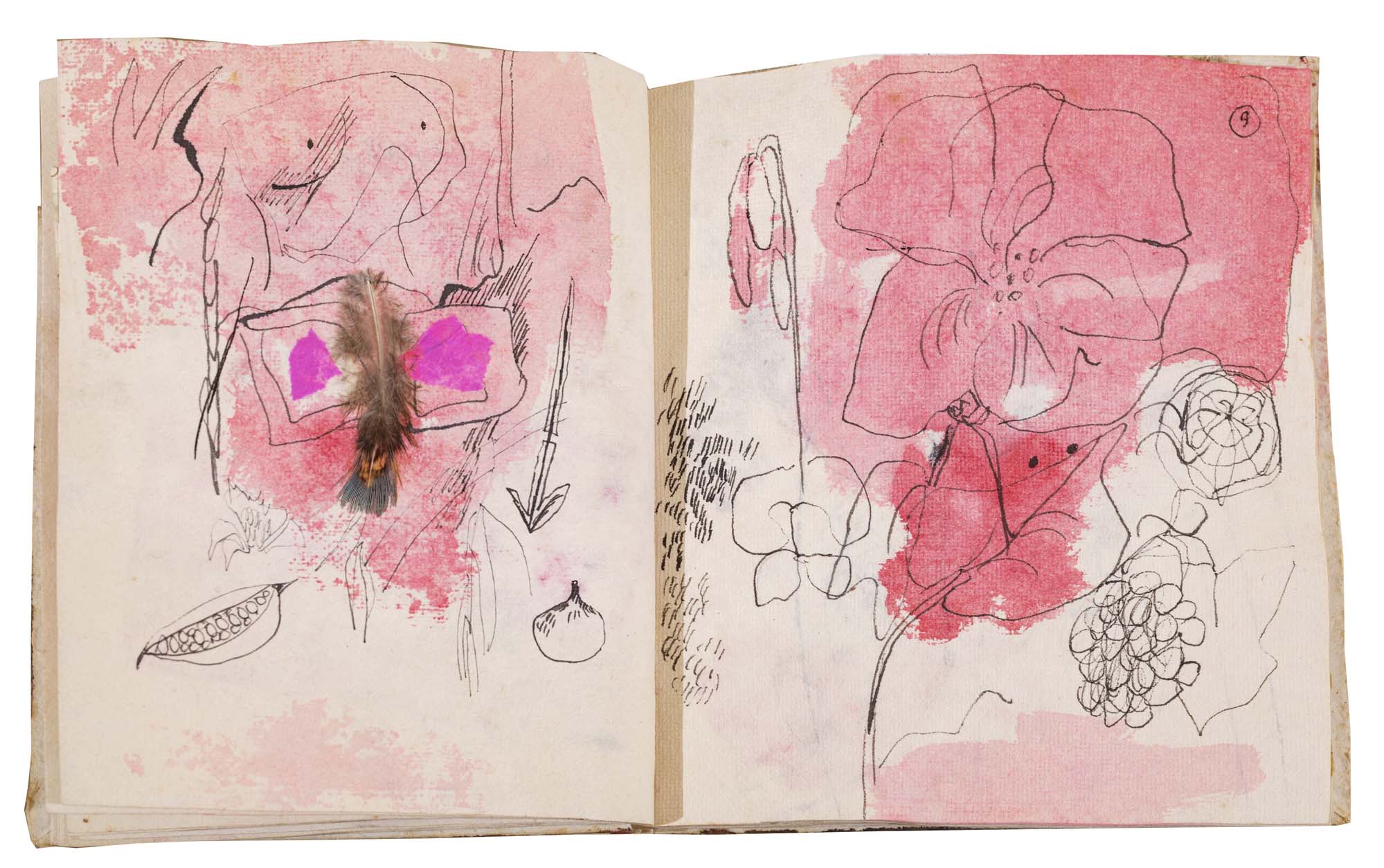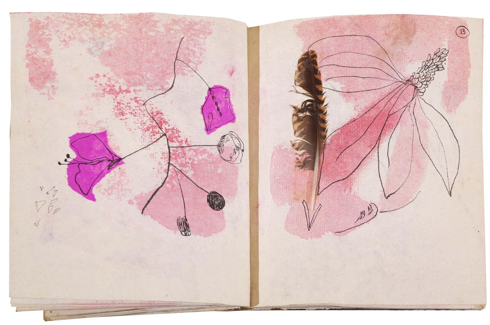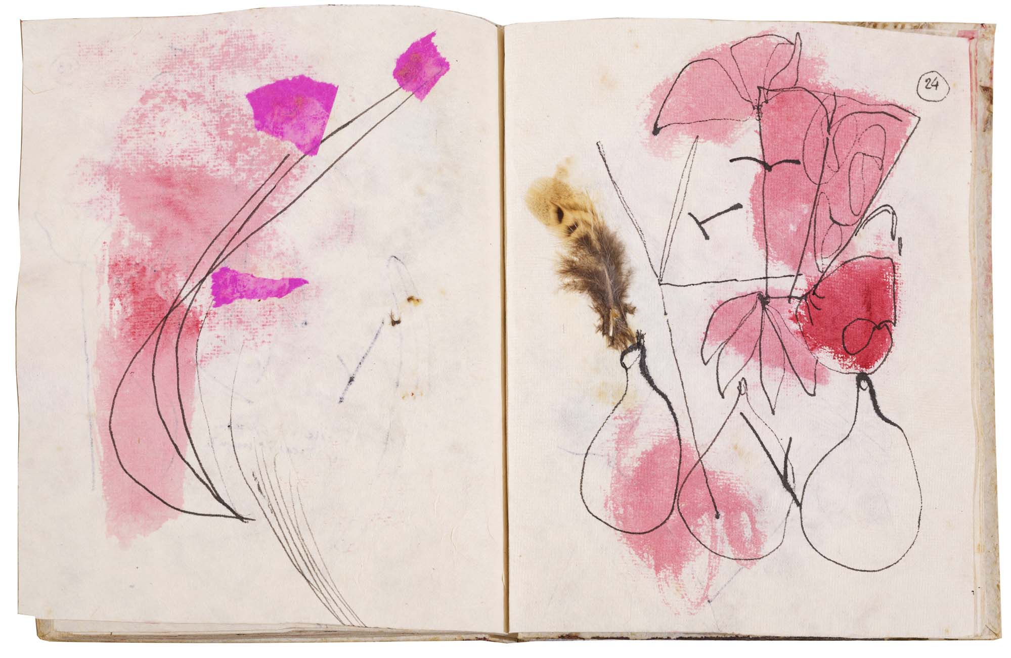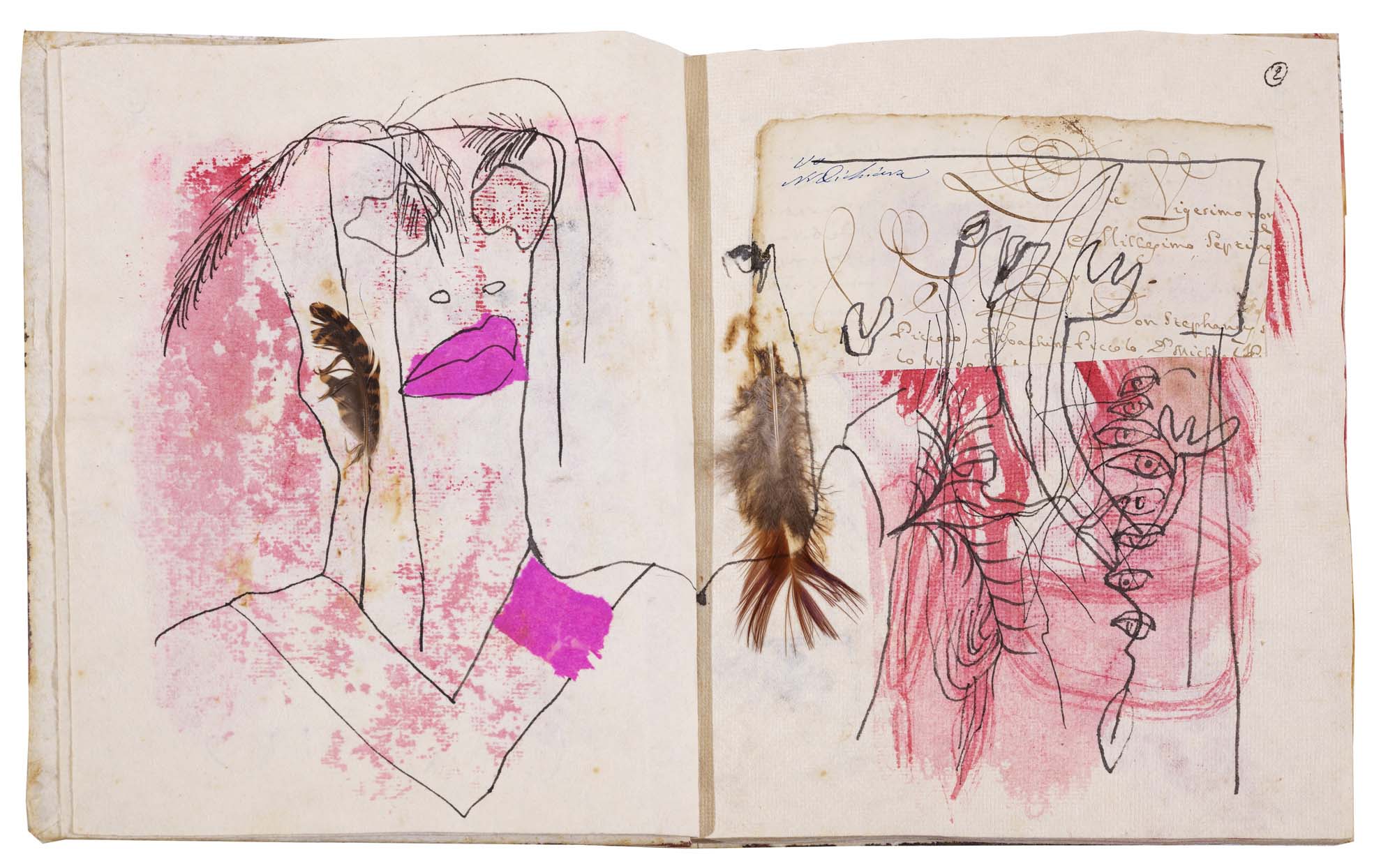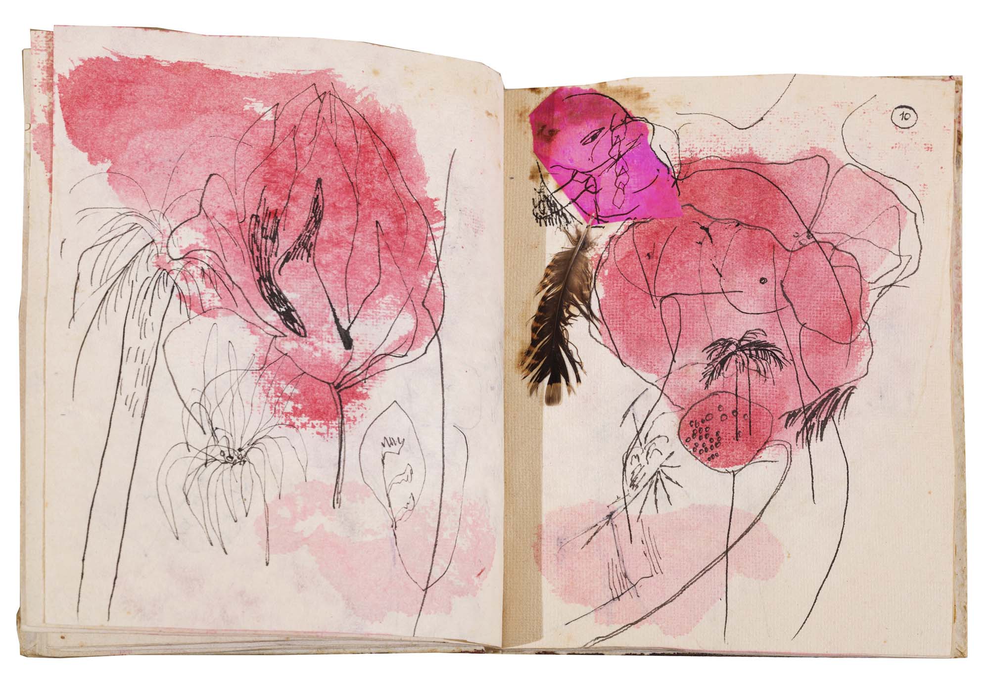 libro rilegato contenente 29 tecniche miste su carta a mano (dipinte entrambe le facciate) cm. 24,5x19 (fogli) - 25,5x23x2 (libro)