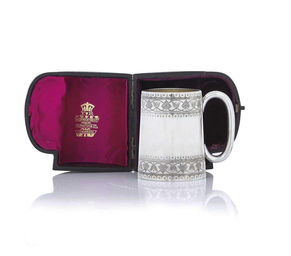 MUG IN ARGENTO, BIRMINGHAM, 1886, decori a motivi floreali incisi e interno vermeil; entro cofanetto.