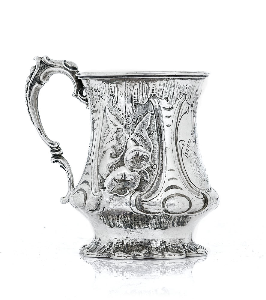 MUG IN ARGENTO, LONDRA, 1857, decori a sbalzi floreali e manico a voluta.