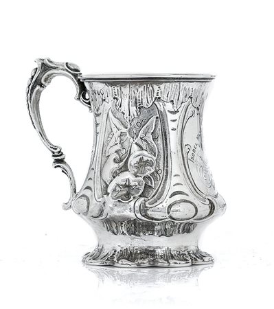 ARGENTI D'EPOCA MUG IN ARGENTO, LONDRA, 1857, decori a sbalzi floreali e...