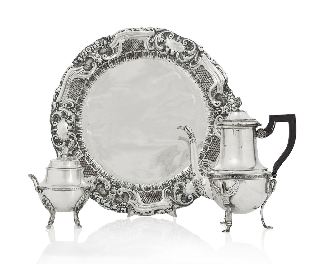 UN CENTROTAVOLA, UNA CAFFETTIERA E UNA ZUCCHERIERA IN ARGENTO, XX SECOLO, centrotavola con bordo sbalzato, caffettiera e zuccheriera in stile Impero.