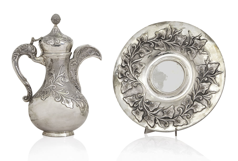 ARGENTI D'EPOCA VERSATOIO CON PIATTO IN ARGENTO, XX SECOLO, sbalzi a rami di...