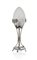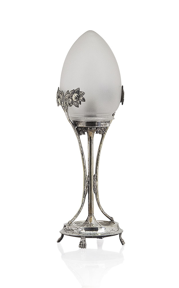 LAMPADA DA TAVOLO LIBERTY IN ARGENTO E VETRO, INIZIO XX SECOLO, tripode su base circolare con piedini e paralume ovoidale satinato.