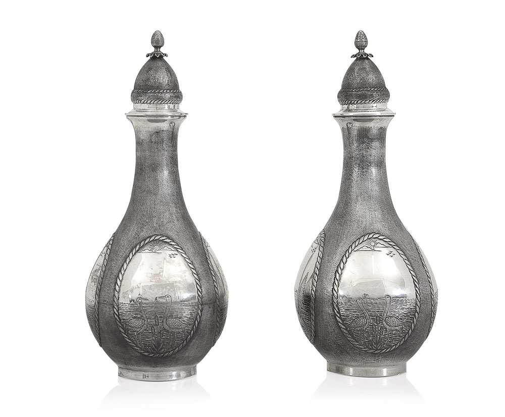 COPPIA DI BOTTIGLIE CON TAPPO IN ARGENTO, XX SECOLO, piriformi, decori incisi a paesaggio entro riserve su fondo satinato.