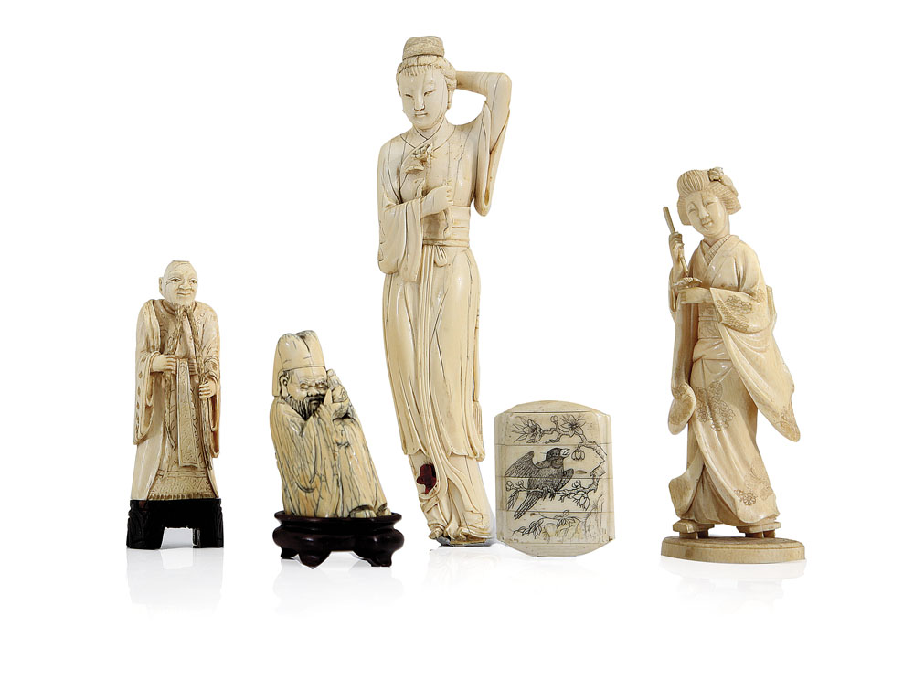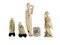 LOTTO DI QUATTRO SCULTURE IN AVORIO, CINA, XX SECOLO, raffiguranti due kwan yin e due santoni, tre con basi in legno; uniti ad un inro in osso; mancanze e sbeccature.