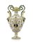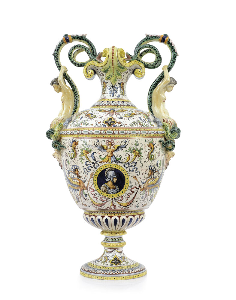 GRANDE VASO IN CERAMICA, INIZIO XX SECOLO, a balaustro con anse a sirene, mascheroni e serpi, decoro policromo a grottesche