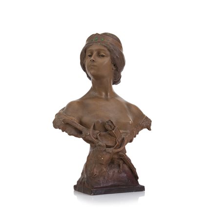 BUSTO DI DIANA IN TERRACOTTA DIPINTA, GOLDSCHEIDER, A. GORY, 1910 CA., con simboli della caccia alla base e decorazioni vitree; firma incisa e marchi in pasta e numerali; sbeccatura.