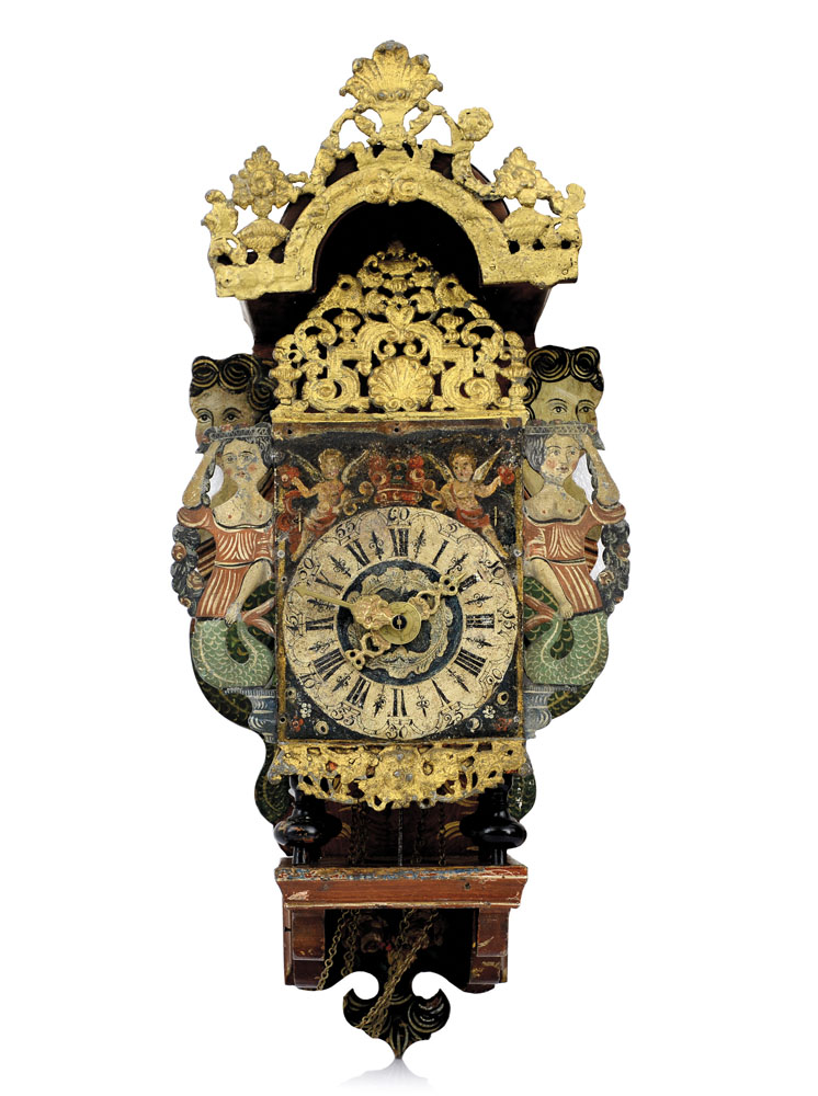 OROLOGIO DA MURO IN LEGNO E METALLO DIPINTO E DORATO, FRISIA, XVIII SECOLO, cassa sagomata e traforata a chimere e volute mistilinee, quadrante dipinto con doppia numerazione araba e romana e disco centrale della sveglia, scappamento a verga, suoneria delle ore e delle mezze; difetti, restauri e da revisionare.