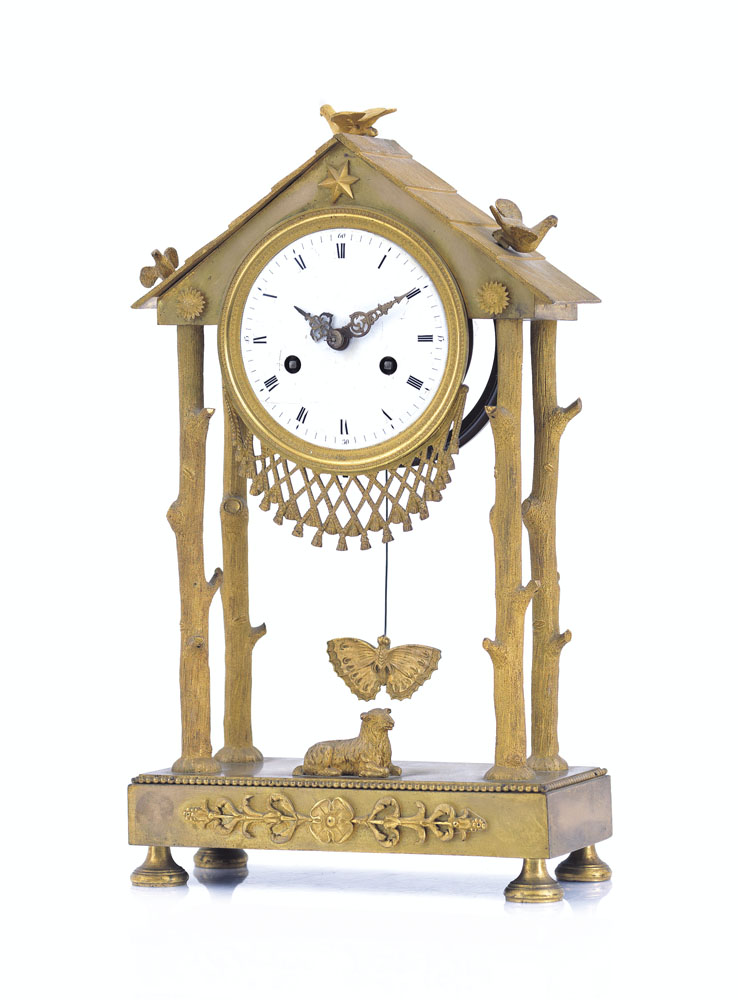 PENDOLA IN BRONZO DORATO, PRIMA META' XIX SECOLO, cassa a tempietto con montanti a tronchi e tetto cimato da colombe, base perlinata con agnello, quadrante smaltato con numeri romani e arabi, suoneria delle ore e delle mezze con pendolo terminante a farfalla; usure e da revisionare.