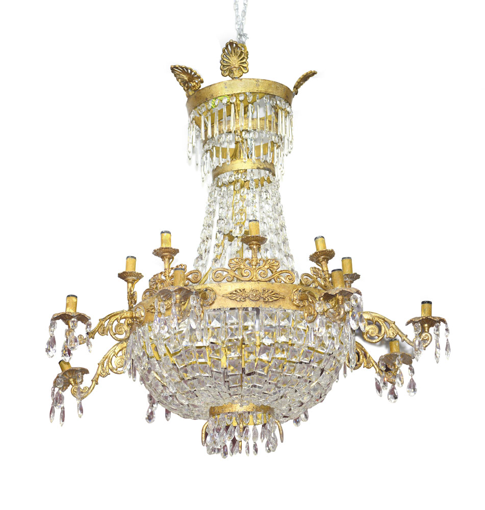 LAMPADARIO IN CRISTALLO E METALLO DORATO, INIZIO XX SECOLO, in stile Impero con pendenti a gocce e geometrici in cristallo; difetti e usure.