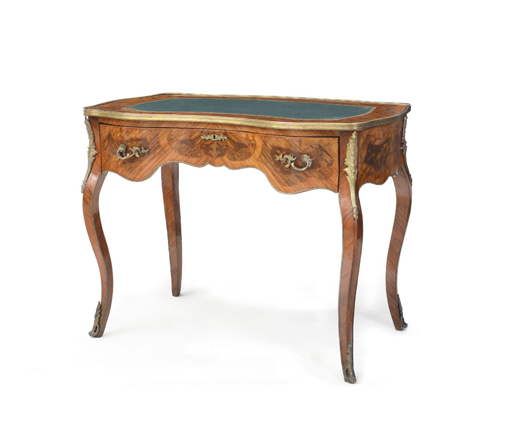 TAVOLO SCRITTOIO INTARSIATO IN LEGNI VARI, FINE XIX SECOLO, piano sagomato con riserva in pelle, fronte con cassetto, guarnizioni in bronzo; sbeccature e usure,