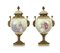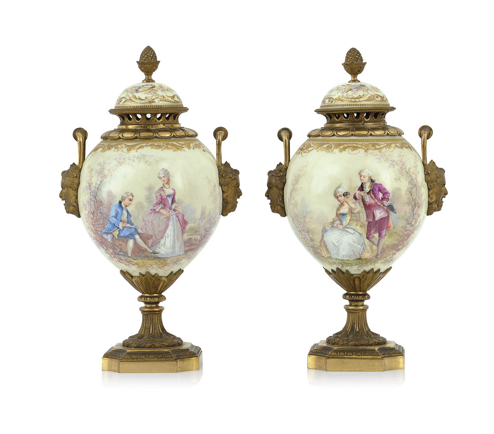 COPPIA DI VASI IN PORCELLANA E BRONZO, FINE XIX SECOLO, ovoidali con coperchio, decori policromi a scene galanti entro paesaggio, anse a teste di fauni.