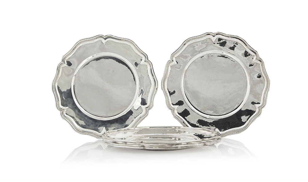 SEI SOTTOPIATTI IN ARGENTO, ANNI '70, bordi polilobati e centinati.