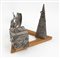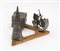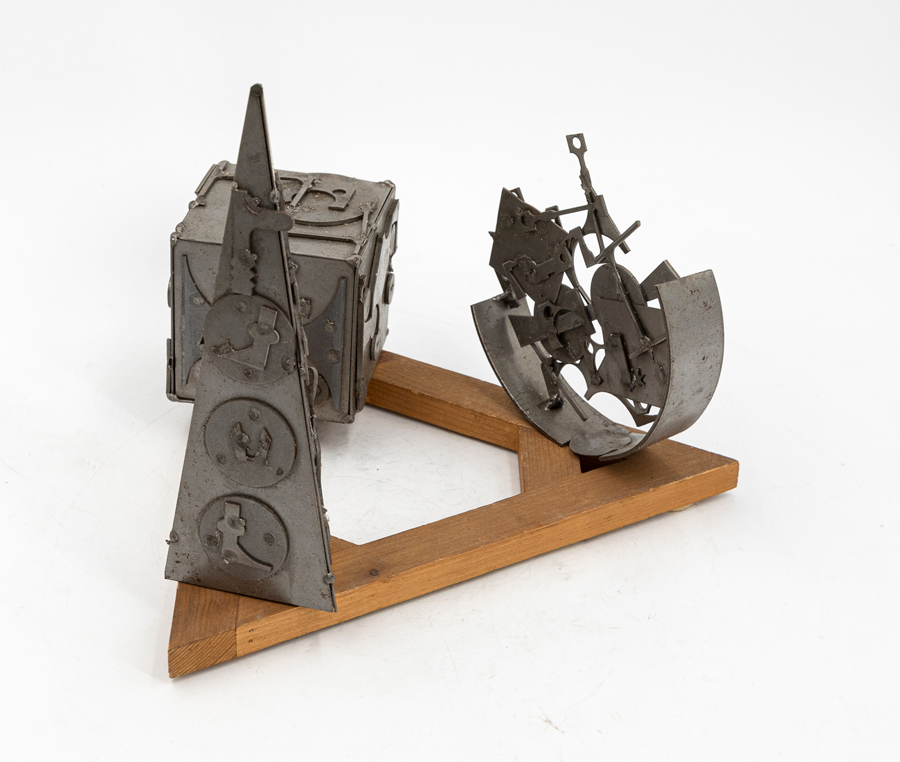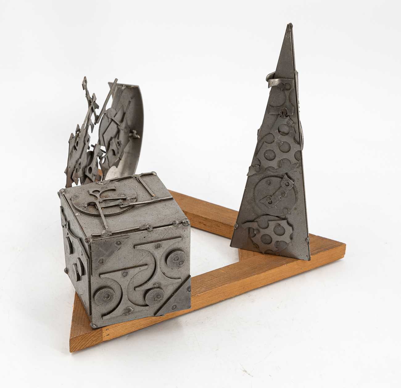 Scultura composta da 3 elementi in ferro verniciato a fuoco (cubo, piramide e semicerchio) e base in legno sagomato