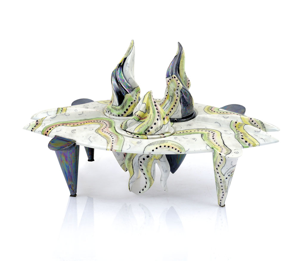 CALAMAIO IN CERAMICA POLICROMA, BERTOZZI & CASONI, IMOLA, ANNI '90, firma in oro sul fondo "Bertozzi - Casoni" e marca "Coop. Ceramica Imola Centro Internazionale Italy".