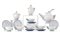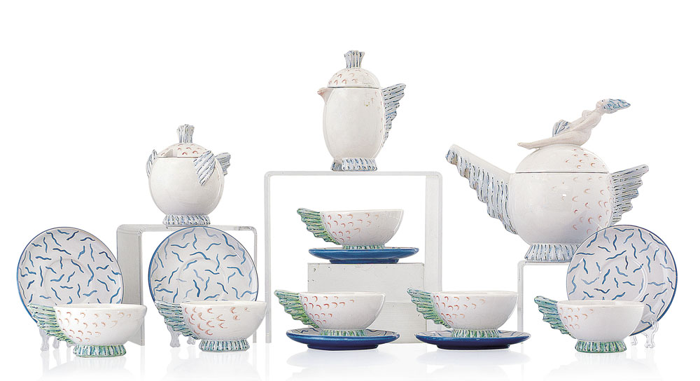 "SERVIZIO DA THE BALNEARE" IN CERAMICA POLICROMA, BERTOZZI & CASONI SU DISEGNO DI UGO LA PIETRA, IMOLA, 1988, composto da teiera, lattiera e zuccheriera con coperchi e sei tazze con piatto, marca "Imolarte Coop. Ceramica Imola" e ape.