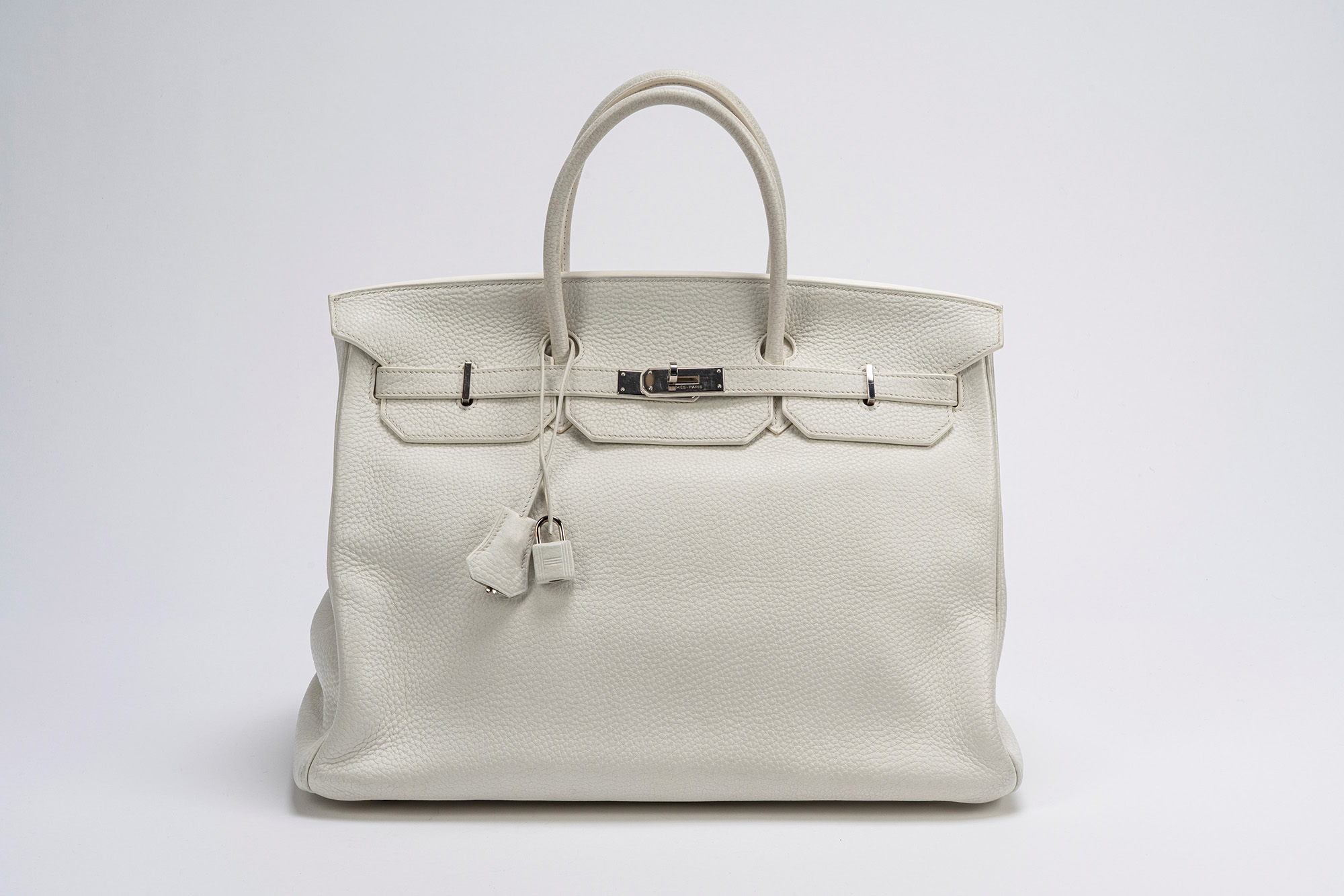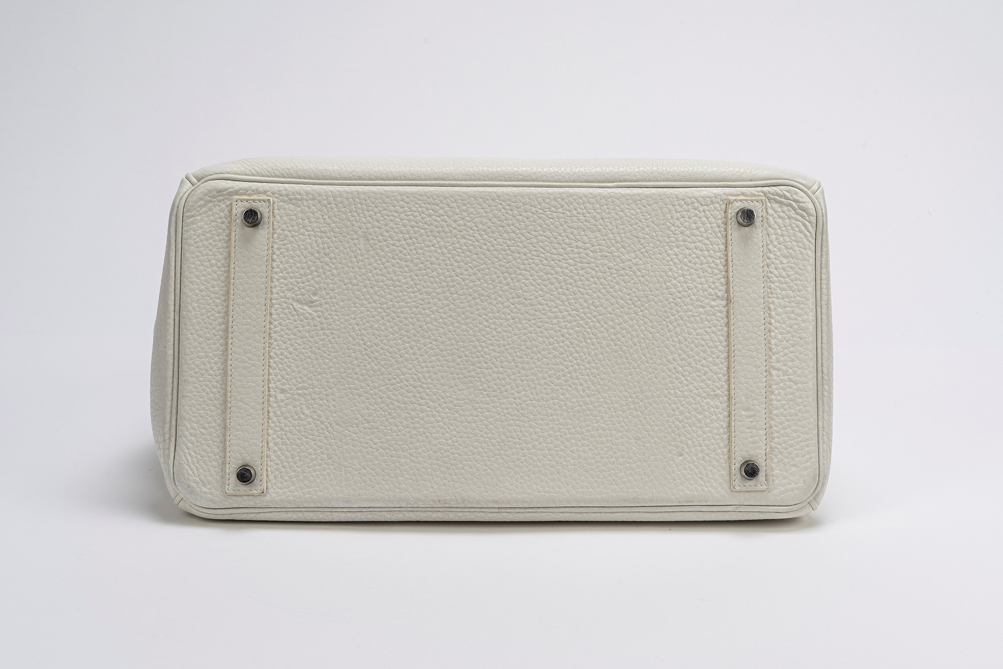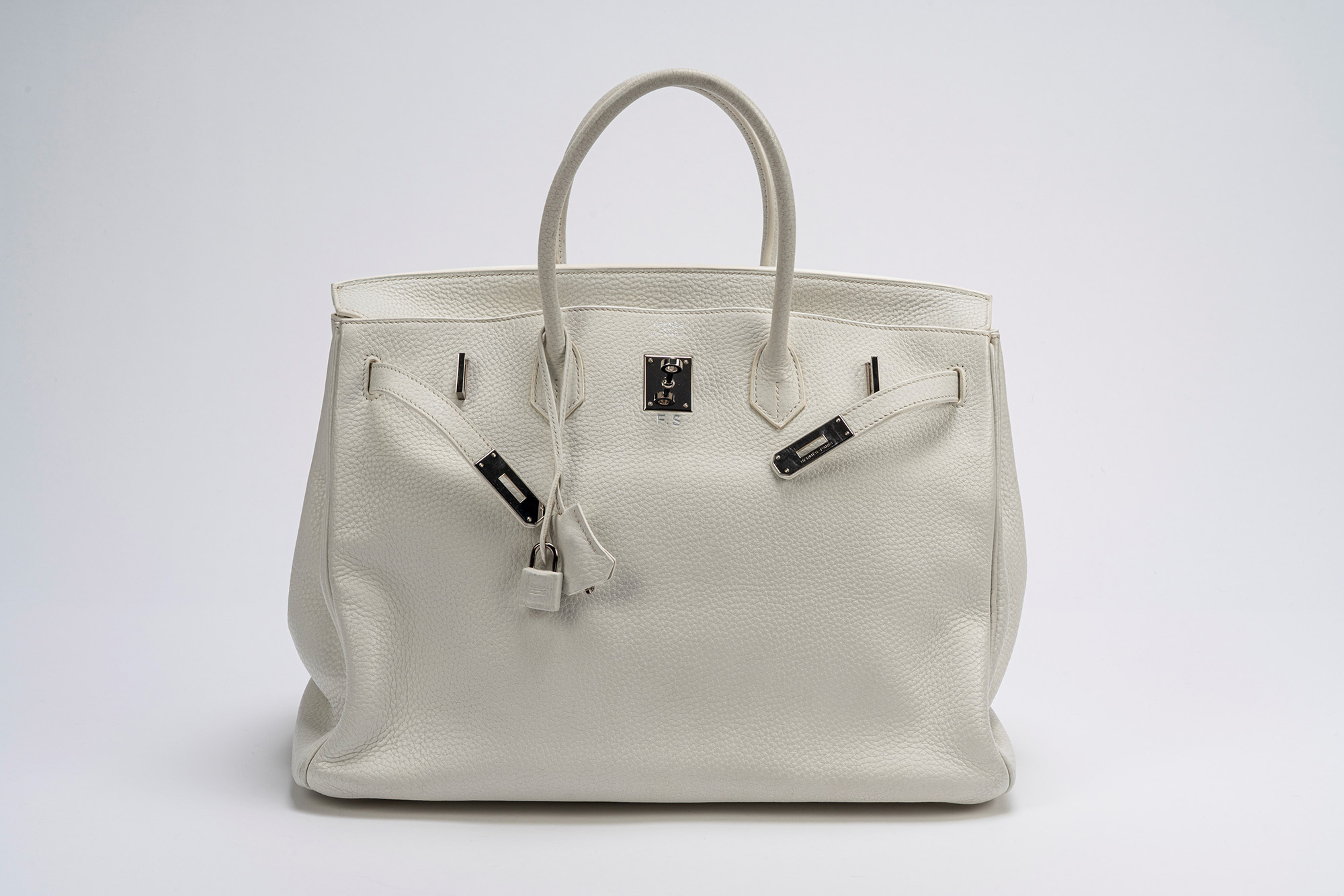 in pelle clemence color bianco, dettagli in palladio, cm 40, con sacchetto, iniziali F.S. (lievissimi segni d'uso)in pelle clemence color bianco, dettagli in palladio, cm 40, con sacchetto, iniziali F.S. (lievissimi segni d'uso)
