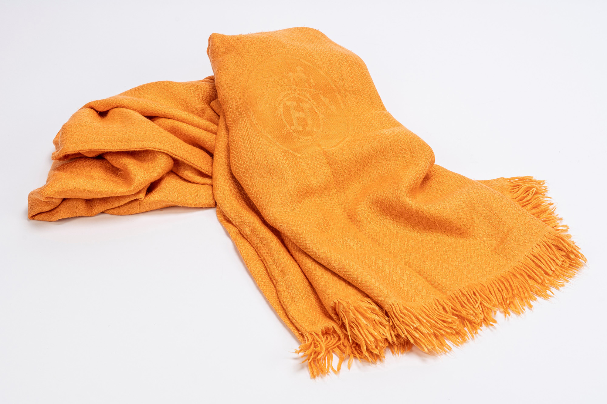 in cachemire e seta color mandarino con frange, cm 110 x 65 (segni d'uso e alcuni fili tirati)in cachemire e seta color mandarino con frange, cm 110 x 65 (segni d'uso e alcuni fili tirati)