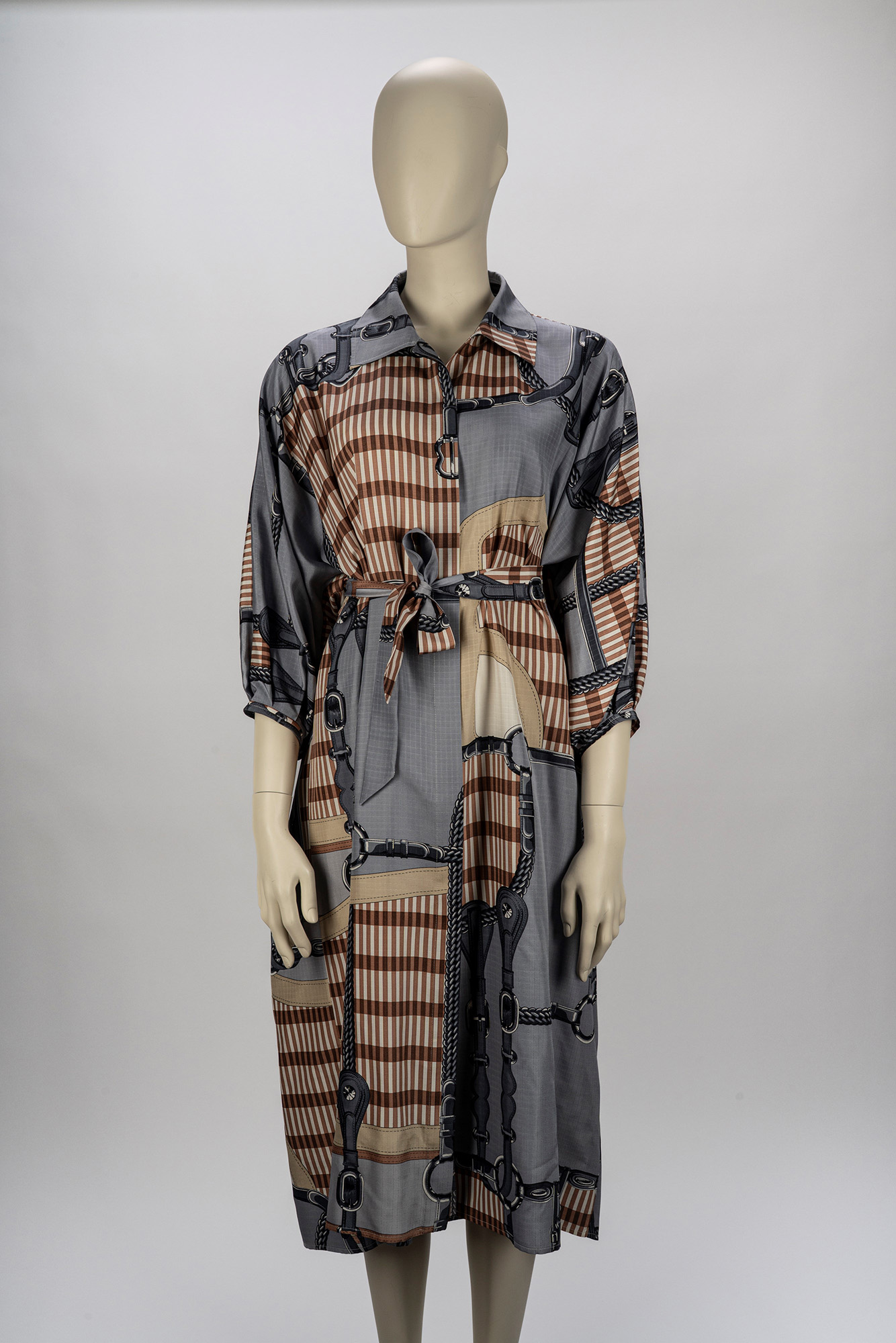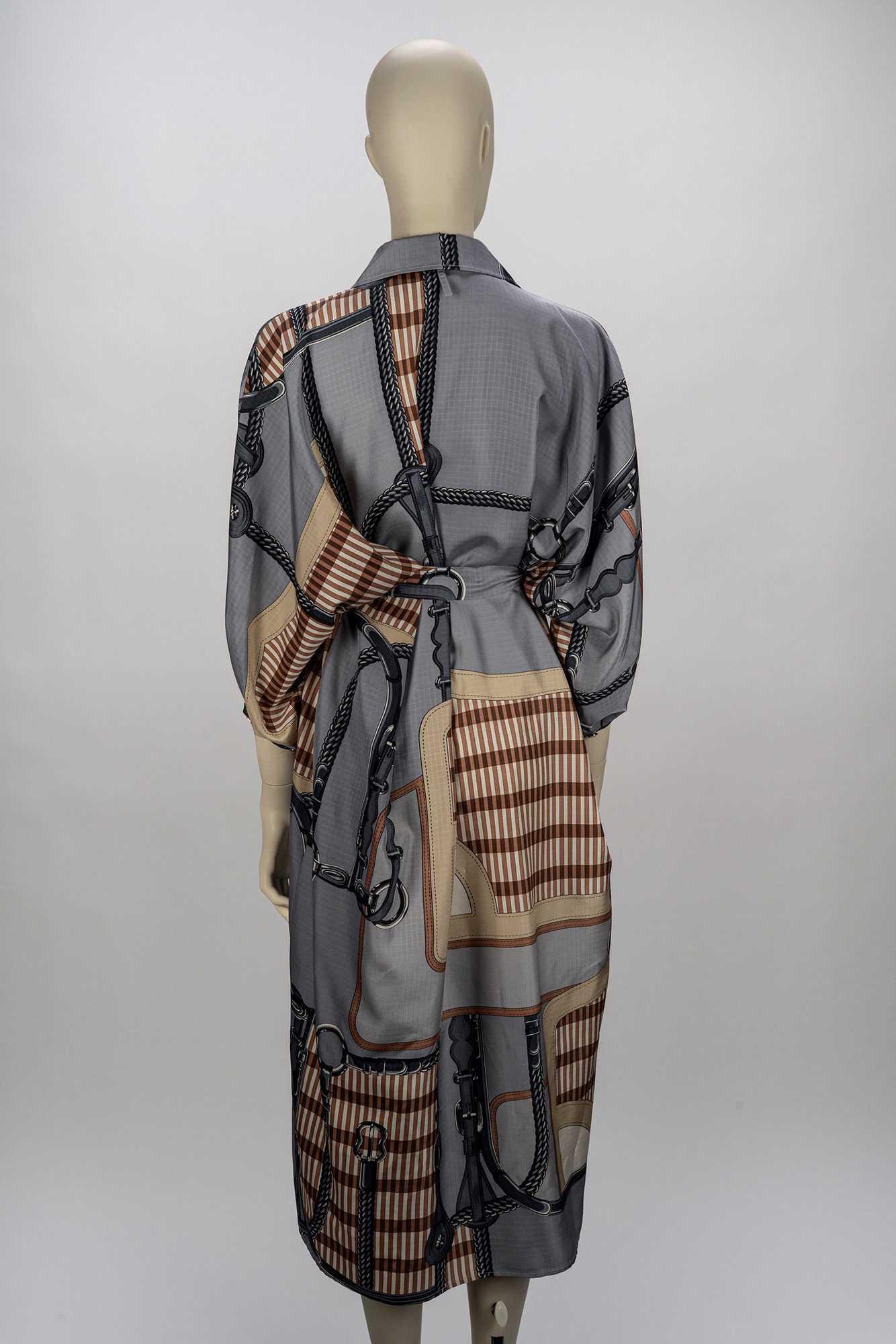in seta stampato, manica al gomito, bottoni in metallo e smalto, chiusura con cintura in vita, taglia 40 in seta stampato, manica al gomito, bottoni in metallo e smalto, chiusura con cintura in vita, taglia 40