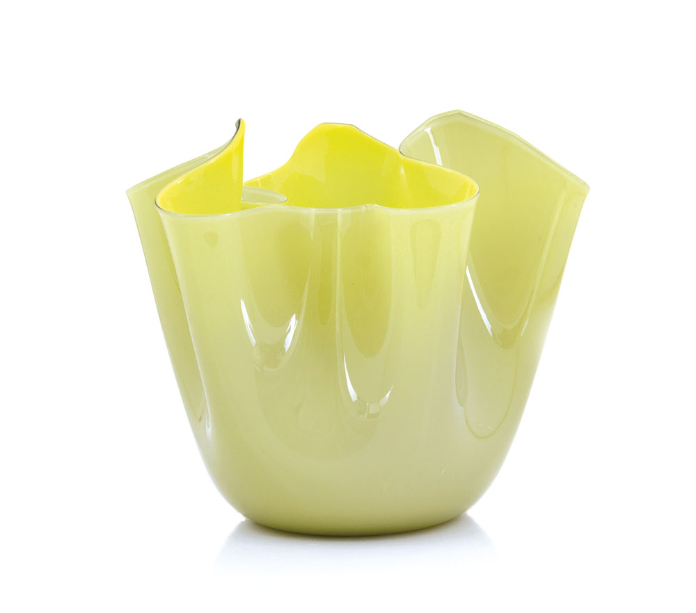 VASO A FAZZOLETTO IN VETRO INCAMICIATO, VENINI, 1989, beige e giallo, firma alla punta "venini 89"