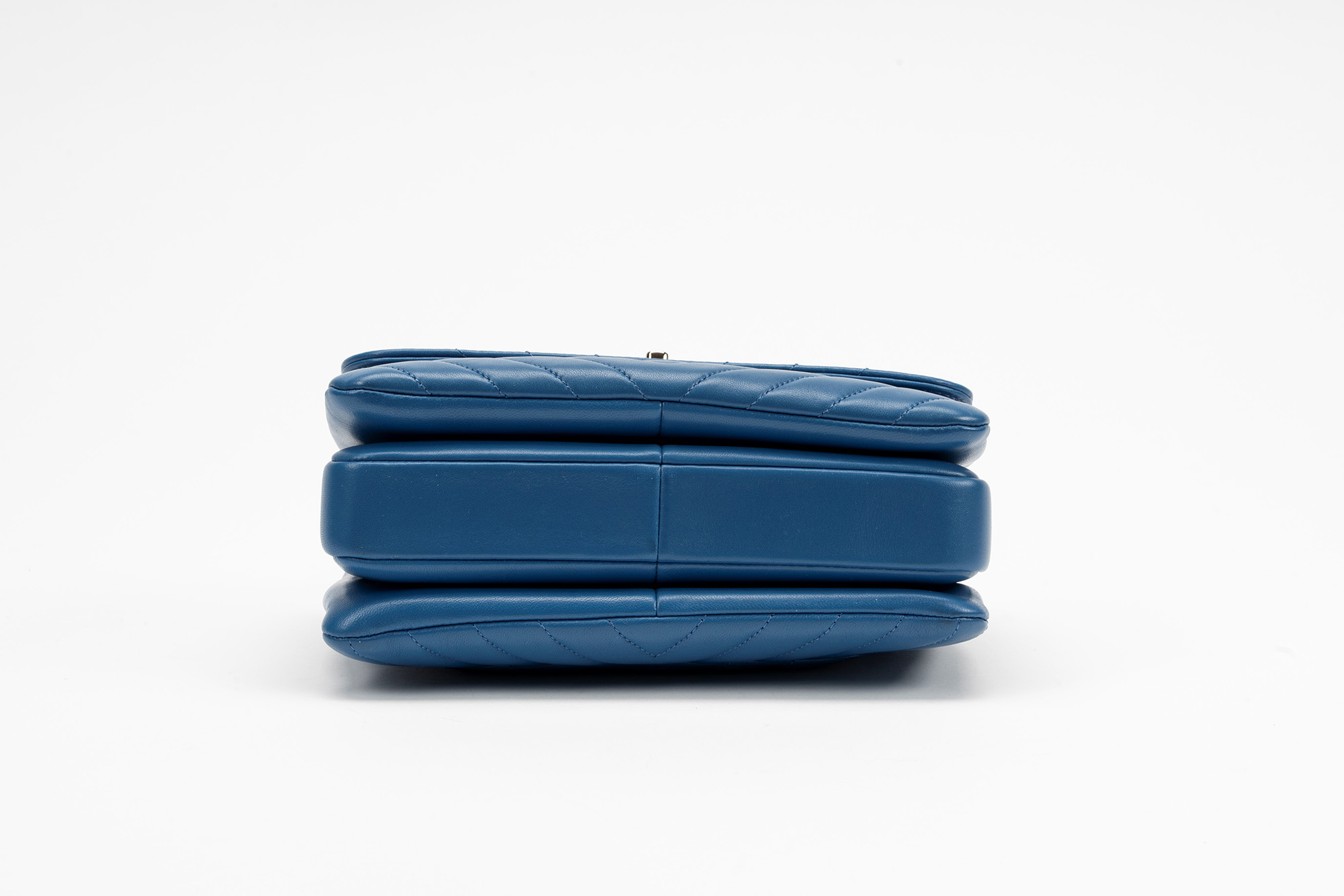 in pelle color bluette, manico e tracolla a catena staccabile, dettagli in metallo, cm 24 (lievissimi segni d'uso)in pelle color bluette, manico e tracolla a catena staccabile, dettagli in metallo, cm 24 (lievissimi segni d'uso)