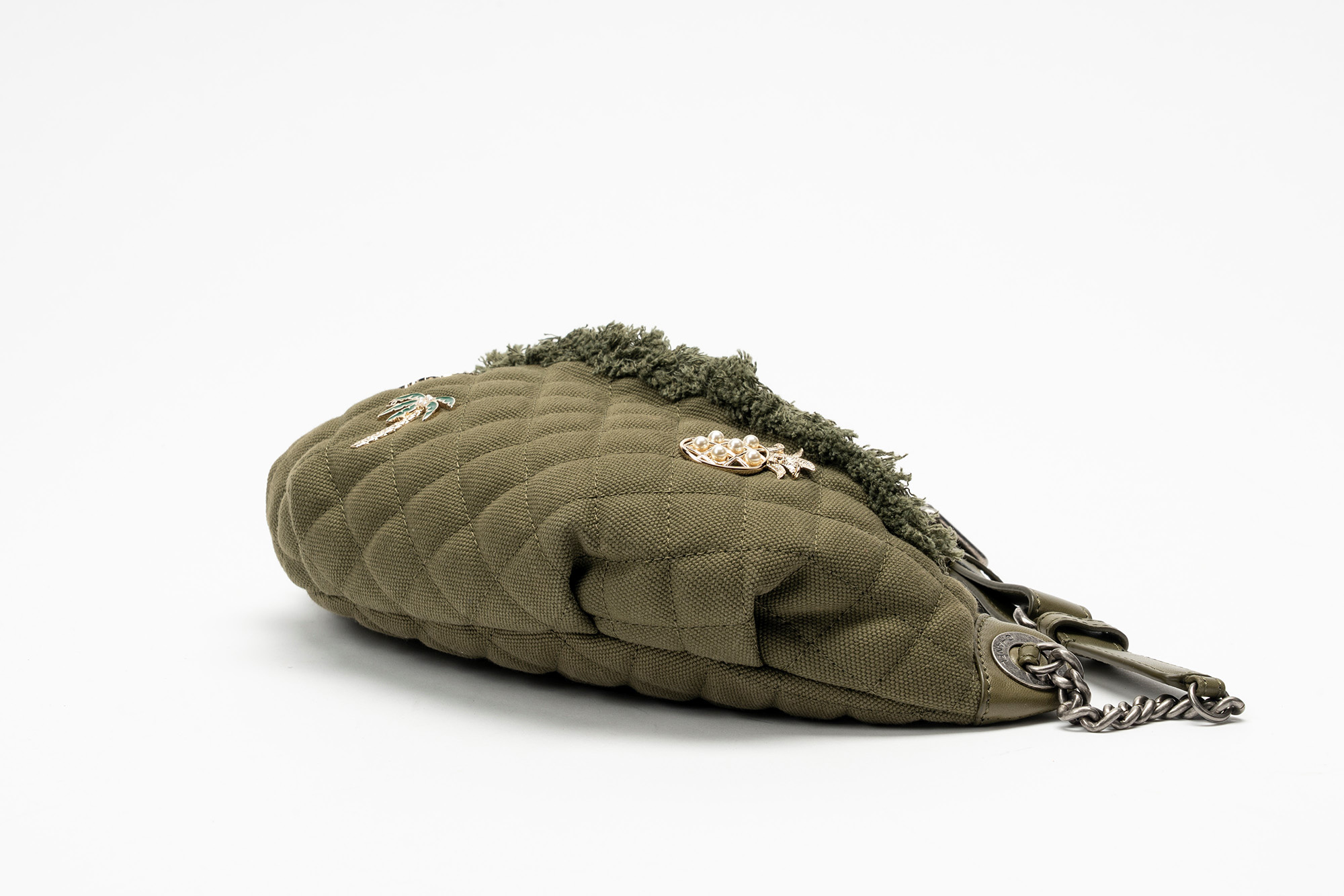 in tela matelassé color verde militare con applicazioni di pins in metallo, smalti e perle fancy, dettagli in pelle e metallo brunito, cm 30 (larghezza massima)in tela matelassé color verde militare con applicazioni di pins in metallo, smalti e perle fancy, dettagli in pelle e metallo brunito, cm 30 (larghezza massima)
