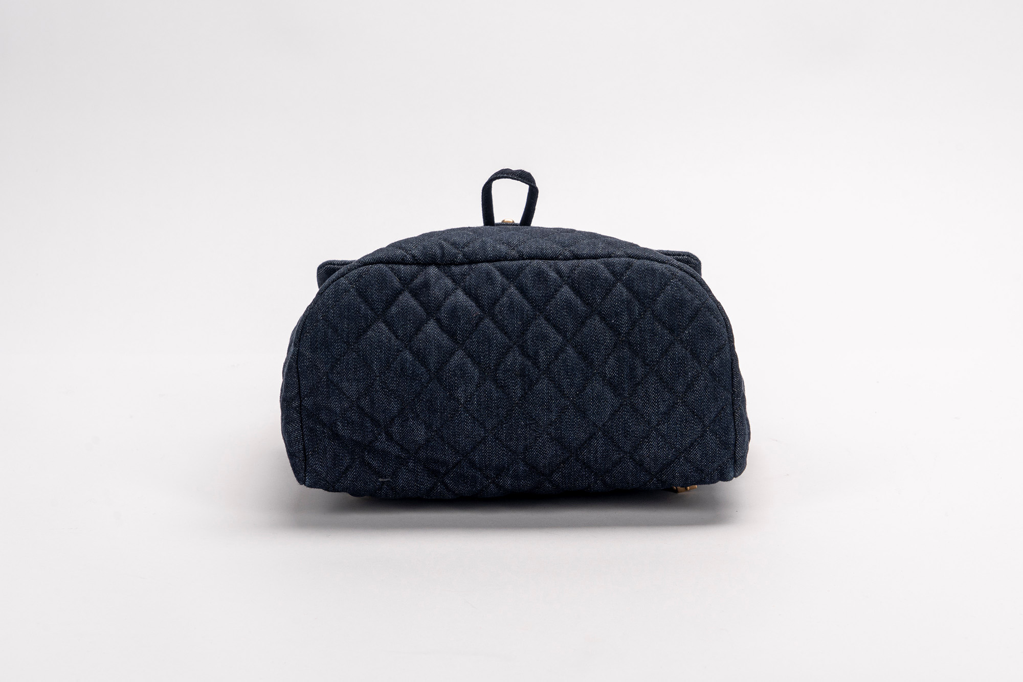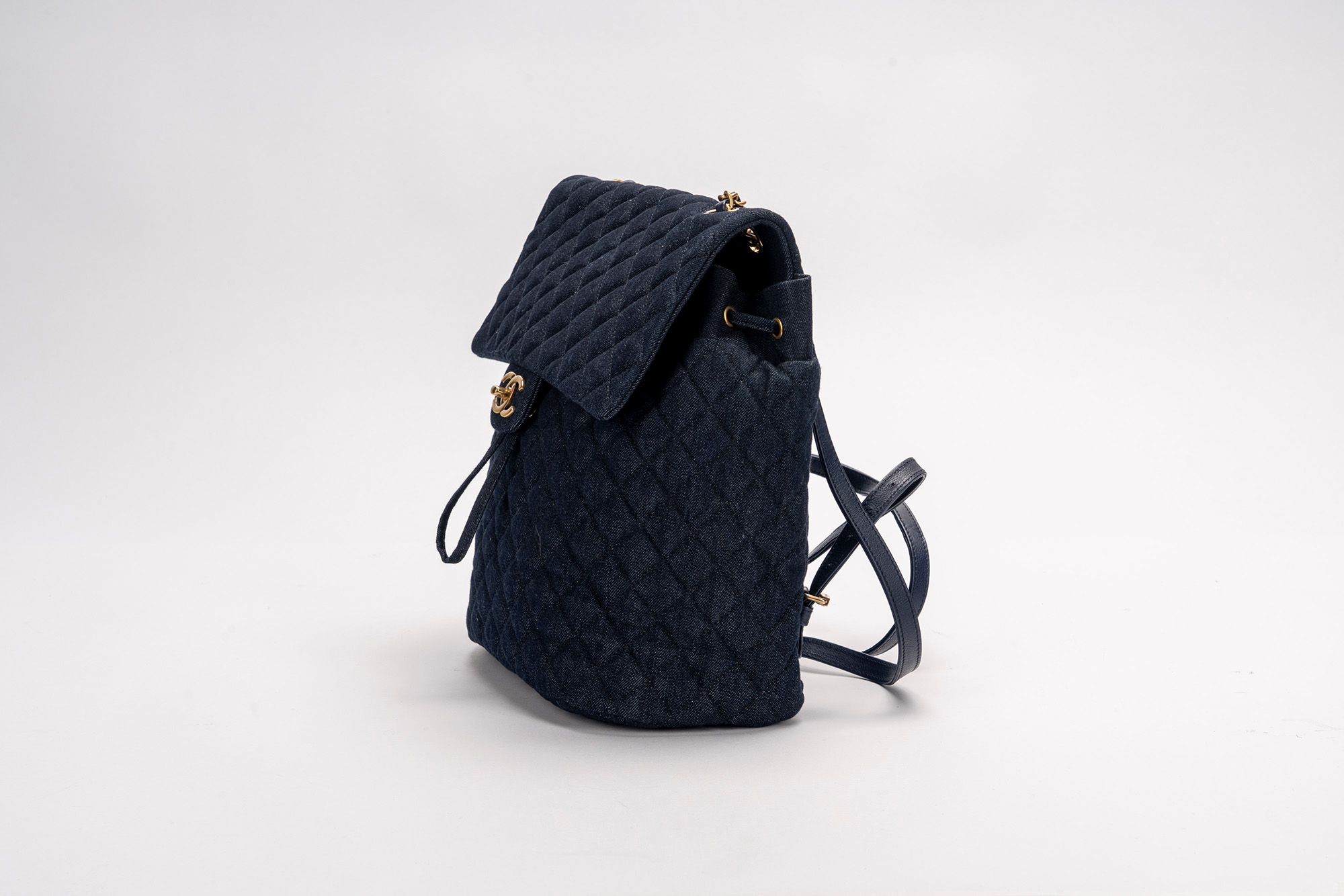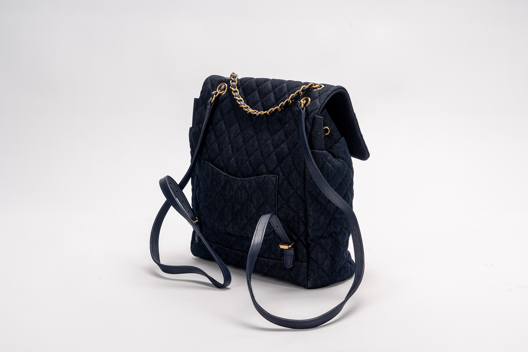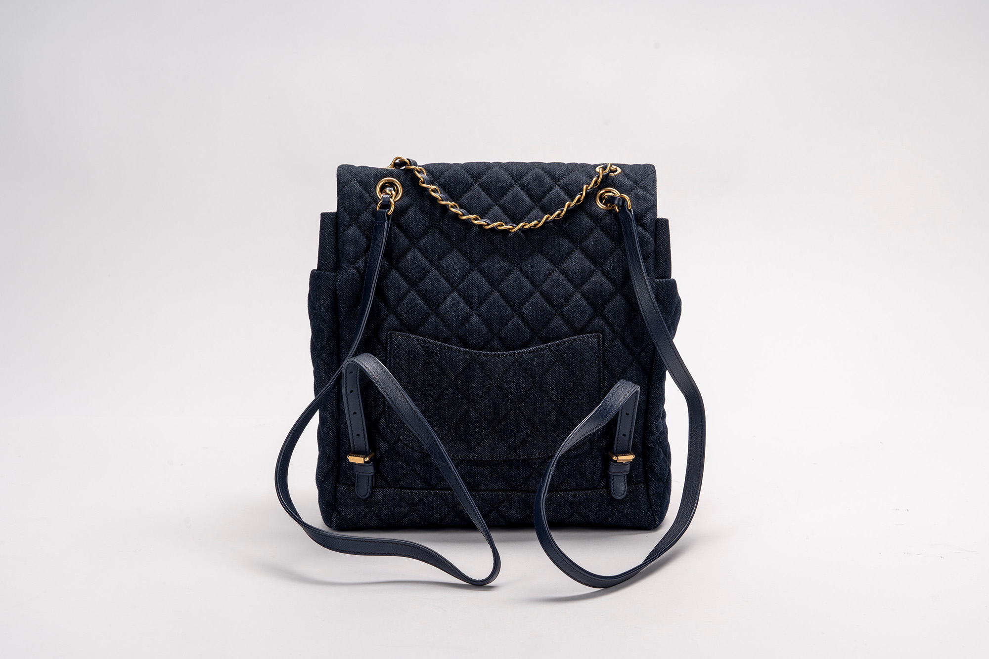 in tela denim color blu scuro, dettagli in metallo dorato, tracolla a catena in pelle, cm 25 x 30in tela denim color blu scuro, dettagli in metallo dorato, tracolla a catena in pelle, cm 25 x 30