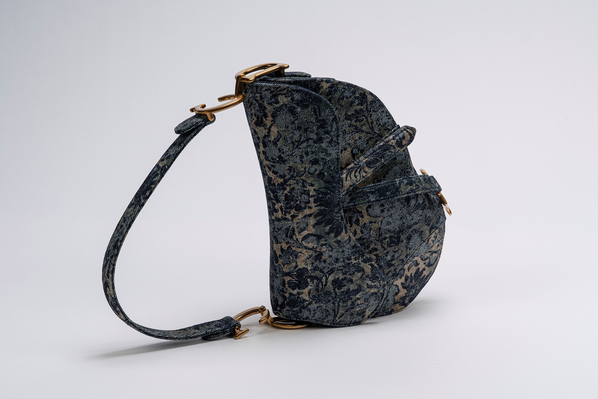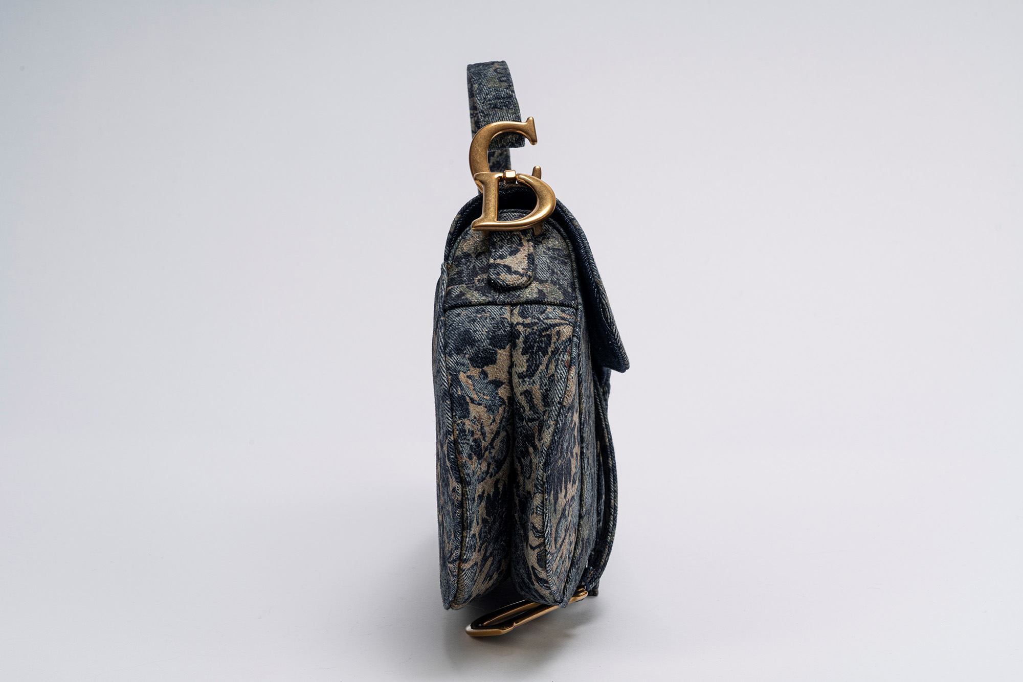 in denim color blu con stampa Dior Brocart, tracolla staccabile e regolabile, dettagli in metallo dorato brunito, cm 23, con sacchettoin denim color blu con stampa Dior Brocart, tracolla staccabile e regolabile, dettagli in metallo dorato brunito, cm 23, con sacchetto