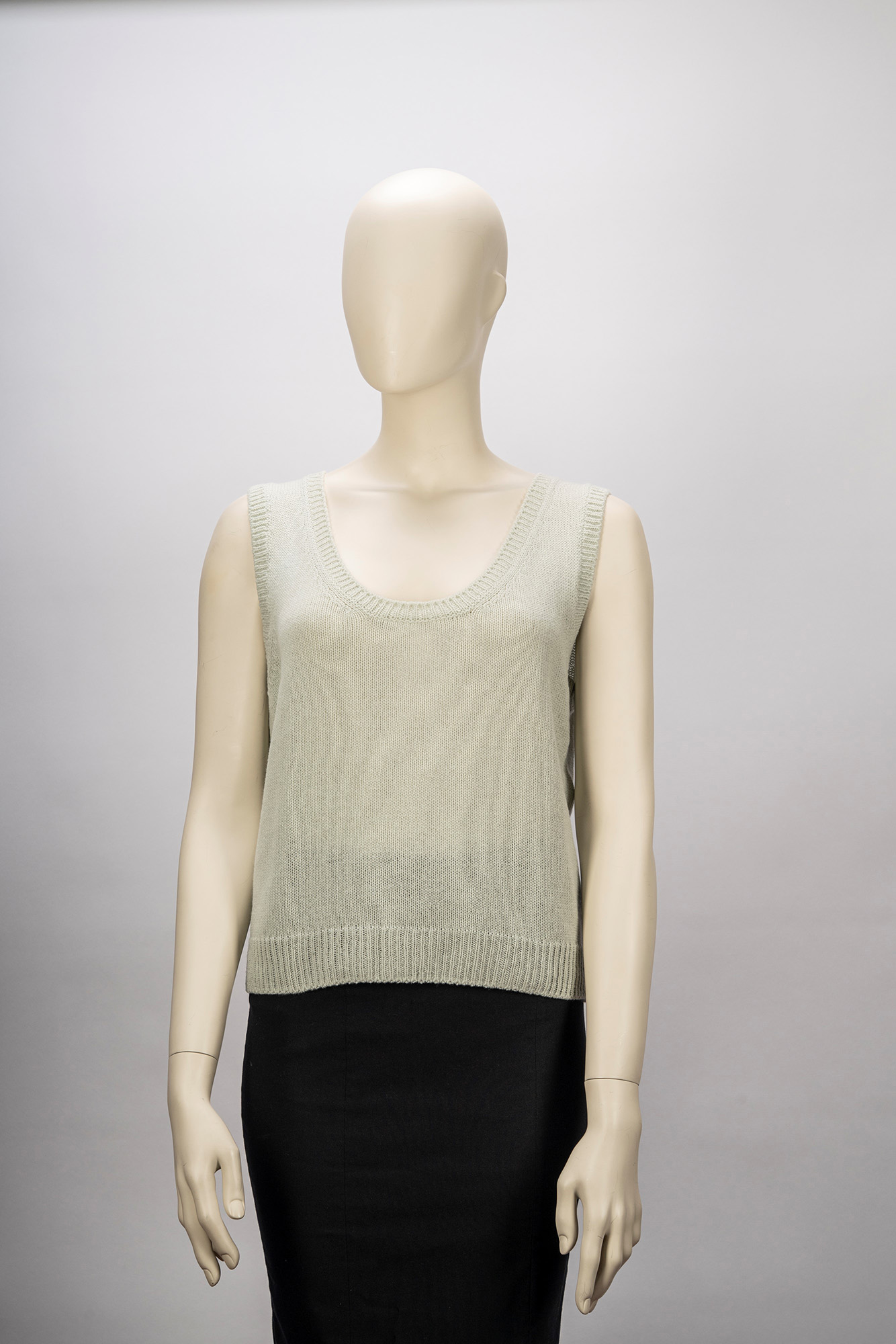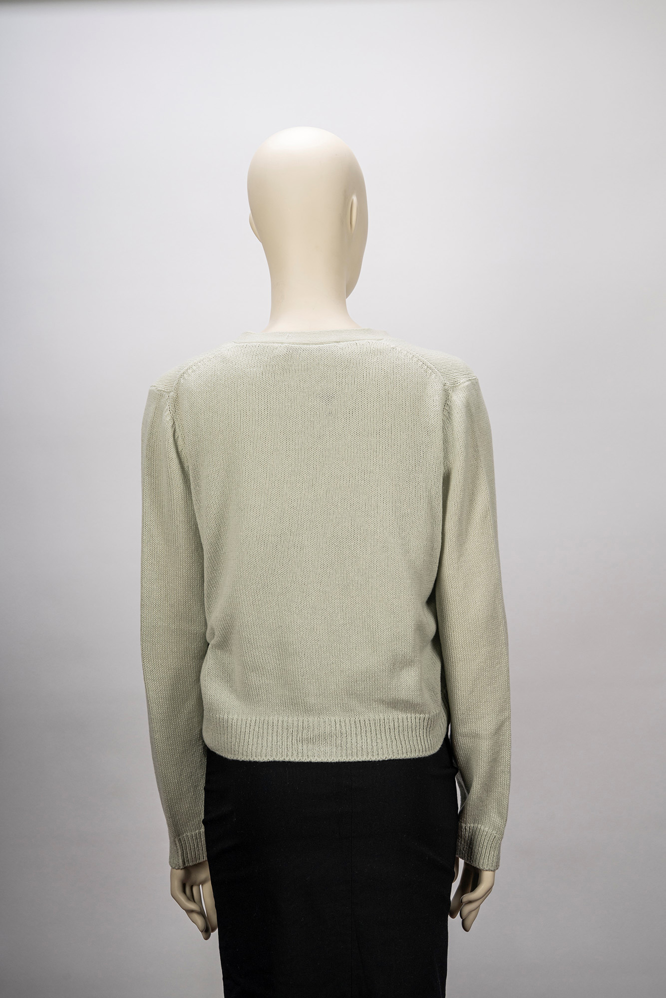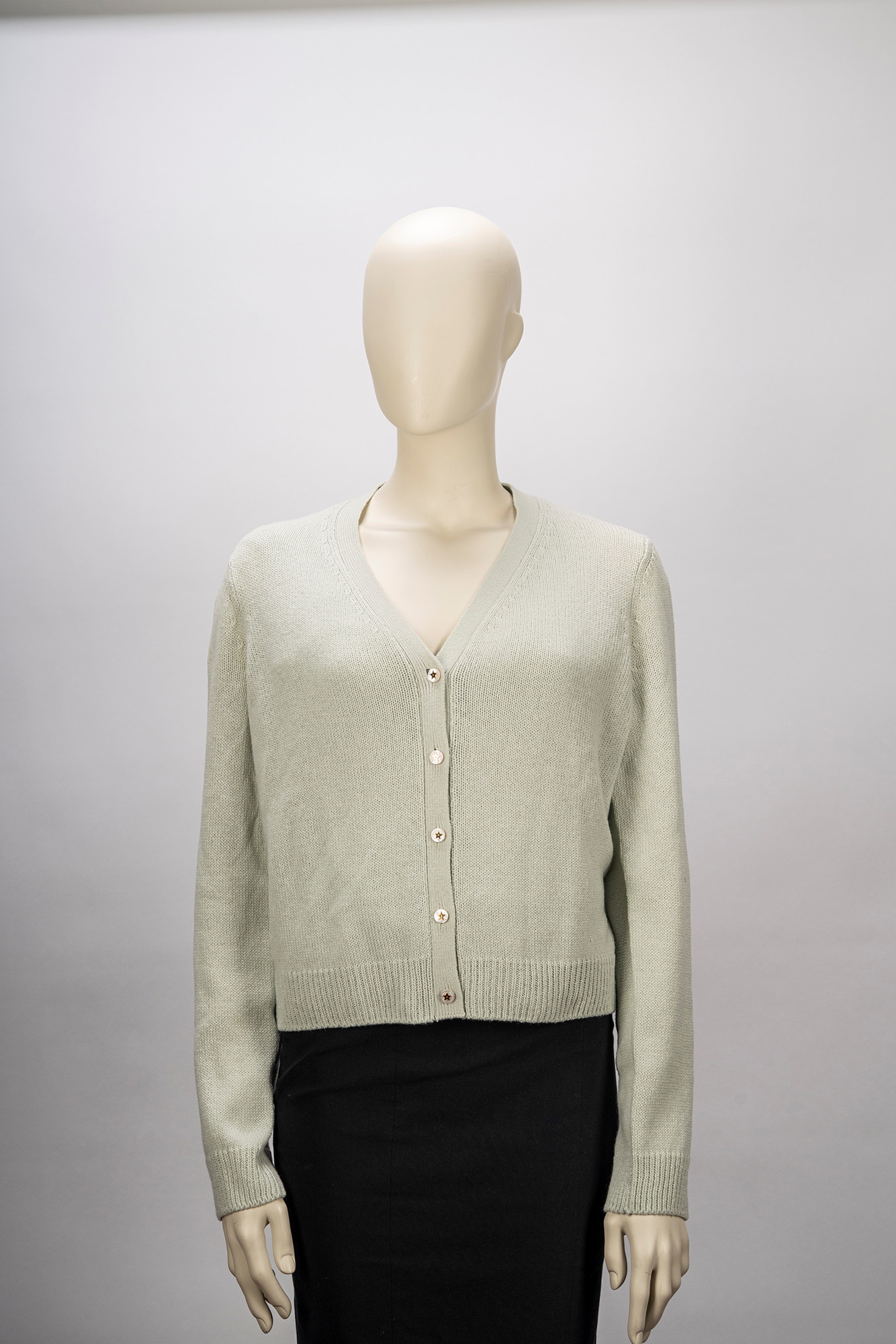 in cachemire color verde acqua, composto da una canotta girocollo e da un cardigan con bottoni in madreperla e metallo dorato,  taglia francese 46in cachemire color verde acqua, composto da una canotta girocollo e da un cardigan con bottoni in madreperla e metallo dorato,  taglia francese 46