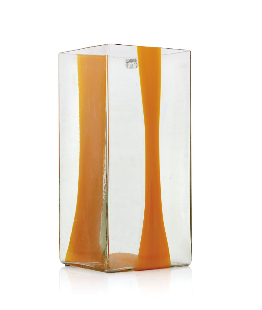 VASO IN VETRO, VENINI, L.DIAZ DE SANTILLANA PER PIERRE CARDIN, 1969 CA., a sezione quadrata con pennellata arancio, firma alla punta "venini Pierre Cardin" ed etichetta originale.