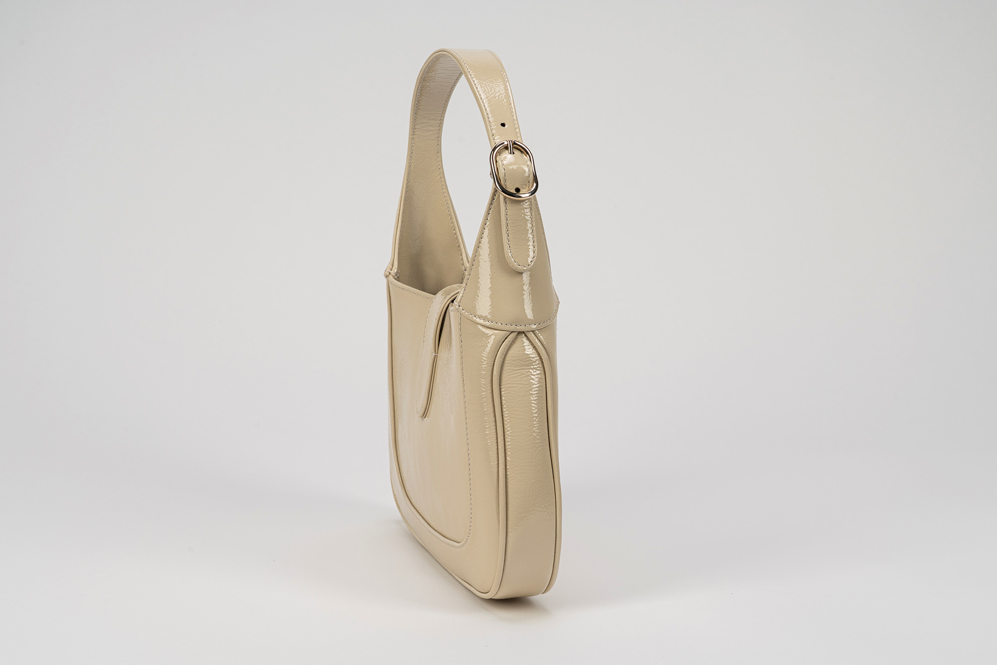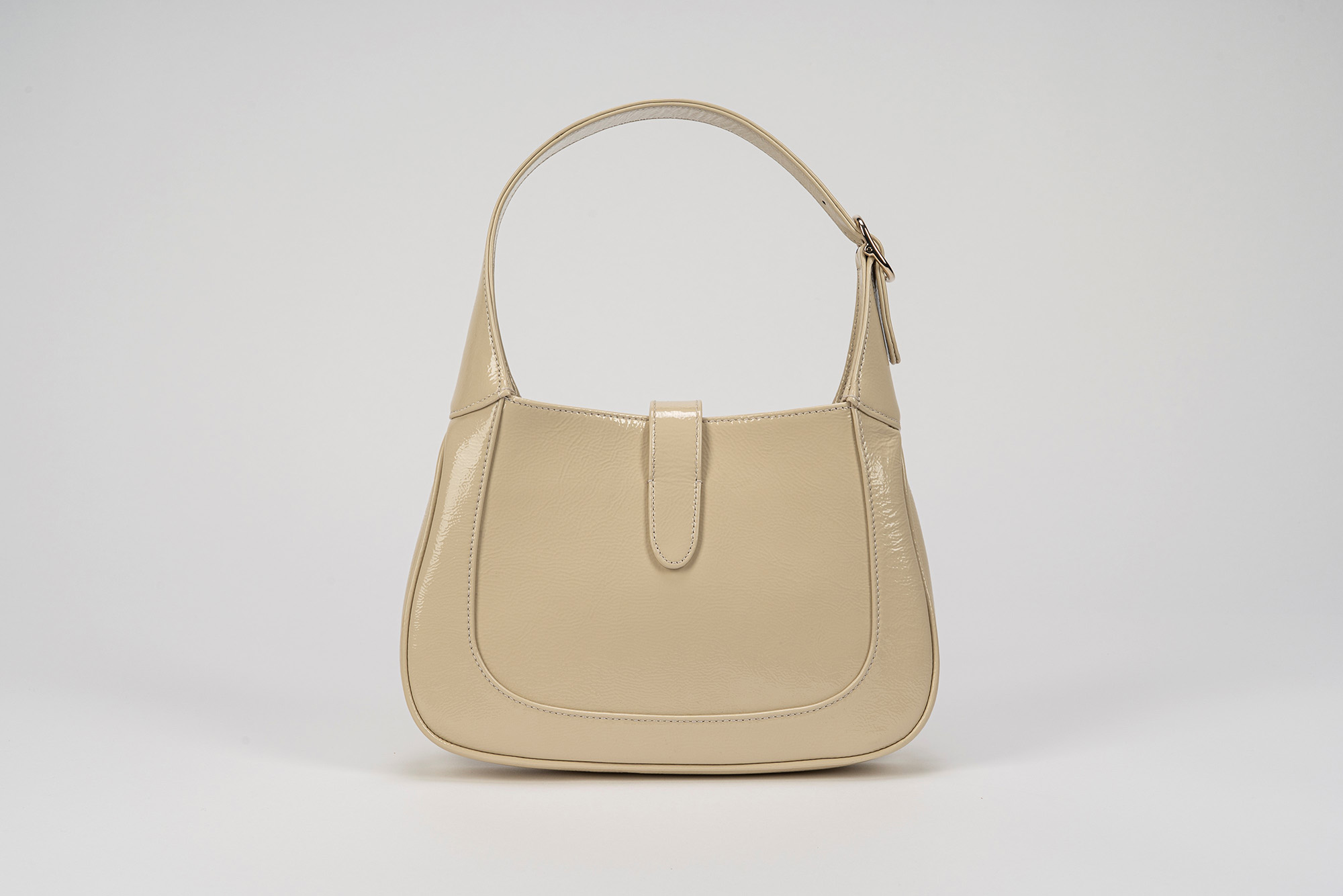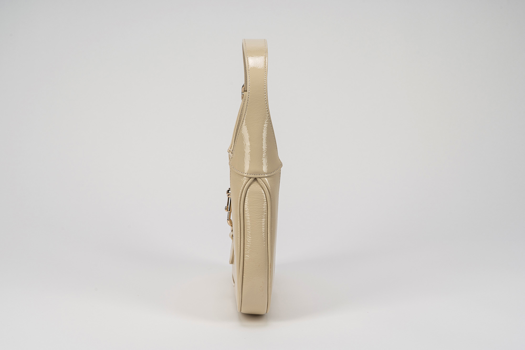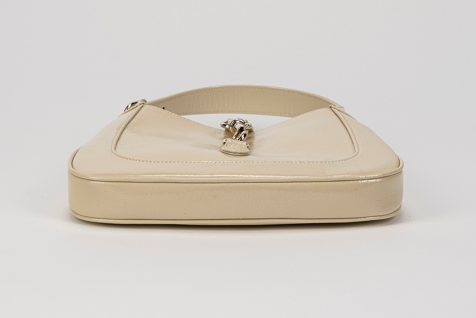 in vernice color champagne, interno in pelle color marrone, dettagli in metallo, manico allungabile con tracolla staccabile in tessuto a banda web color verde e rosso, cm 28 (lievissimi segni d'uso)in vernice color champagne, interno in pelle color marrone, dettagli in metallo, manico allungabile con tracolla staccabile in tessuto a banda web color verde e rosso, cm 28 (lievissimi segni d'uso)