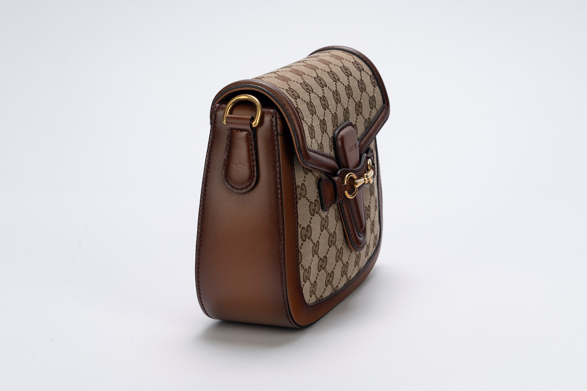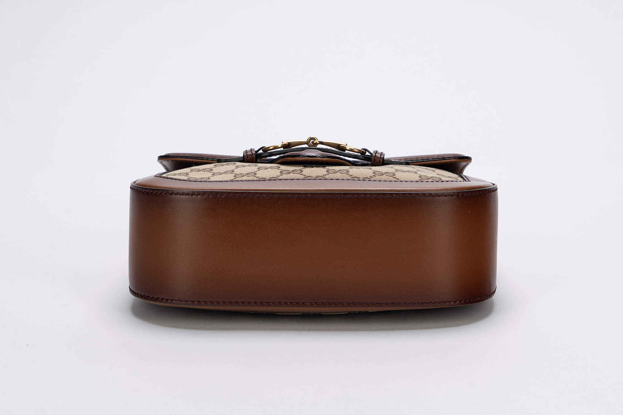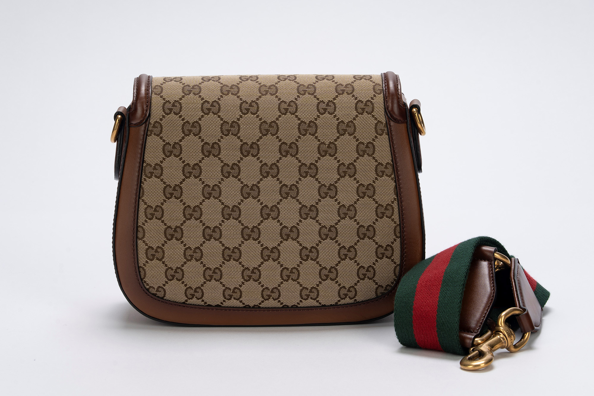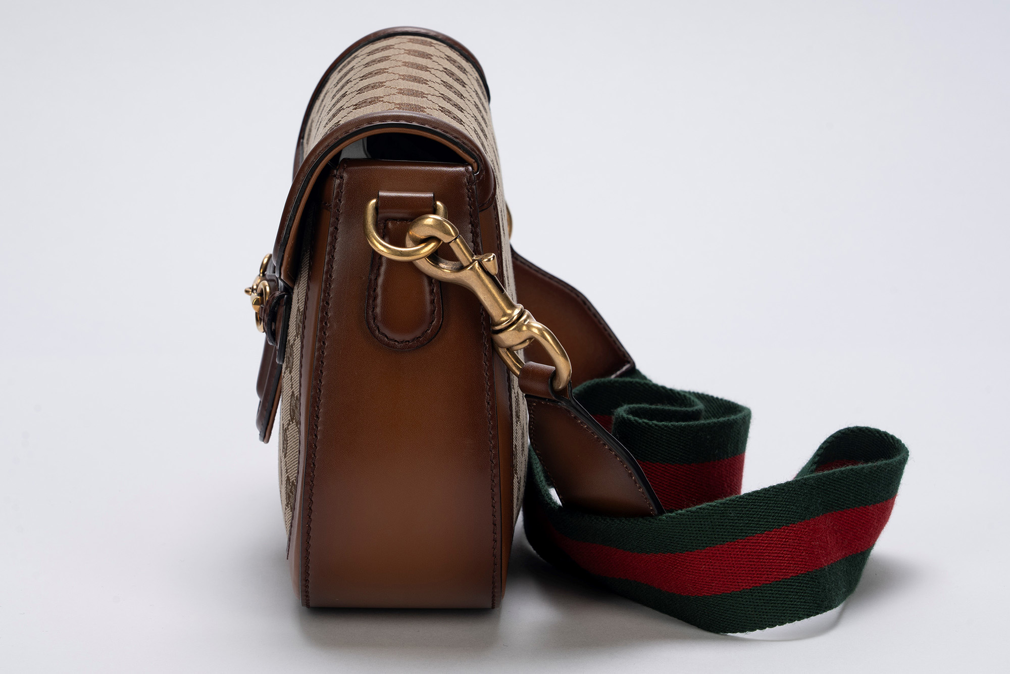 in tessuto logato e pelle color marrone, con tracolla banda web bicolore verde e rosso staccabile e regolabile, dettagli in metallo dorato, cm 24 (lievissimi segni d'uso)in tessuto logato e pelle color marrone, con tracolla banda web bicolore verde e rosso staccabile e regolabile, dettagli in metallo dorato, cm 24 (lievissimi segni d'uso)
