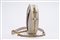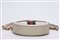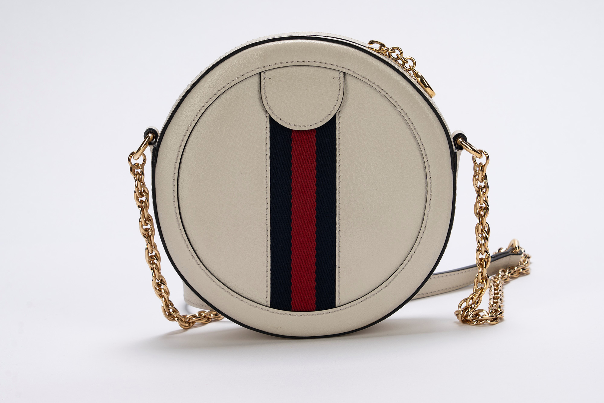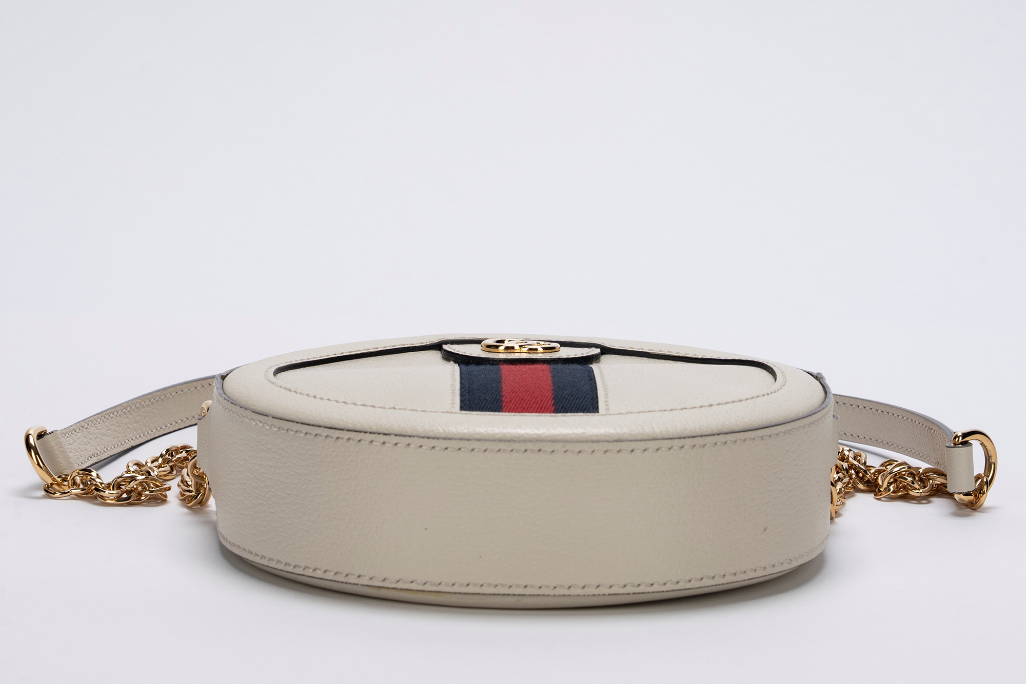 in pelle di cinghiale color crema, tracolla a catena in metallo dorato, banda web color rosso e blu, diametro cm 19, con sacchetto