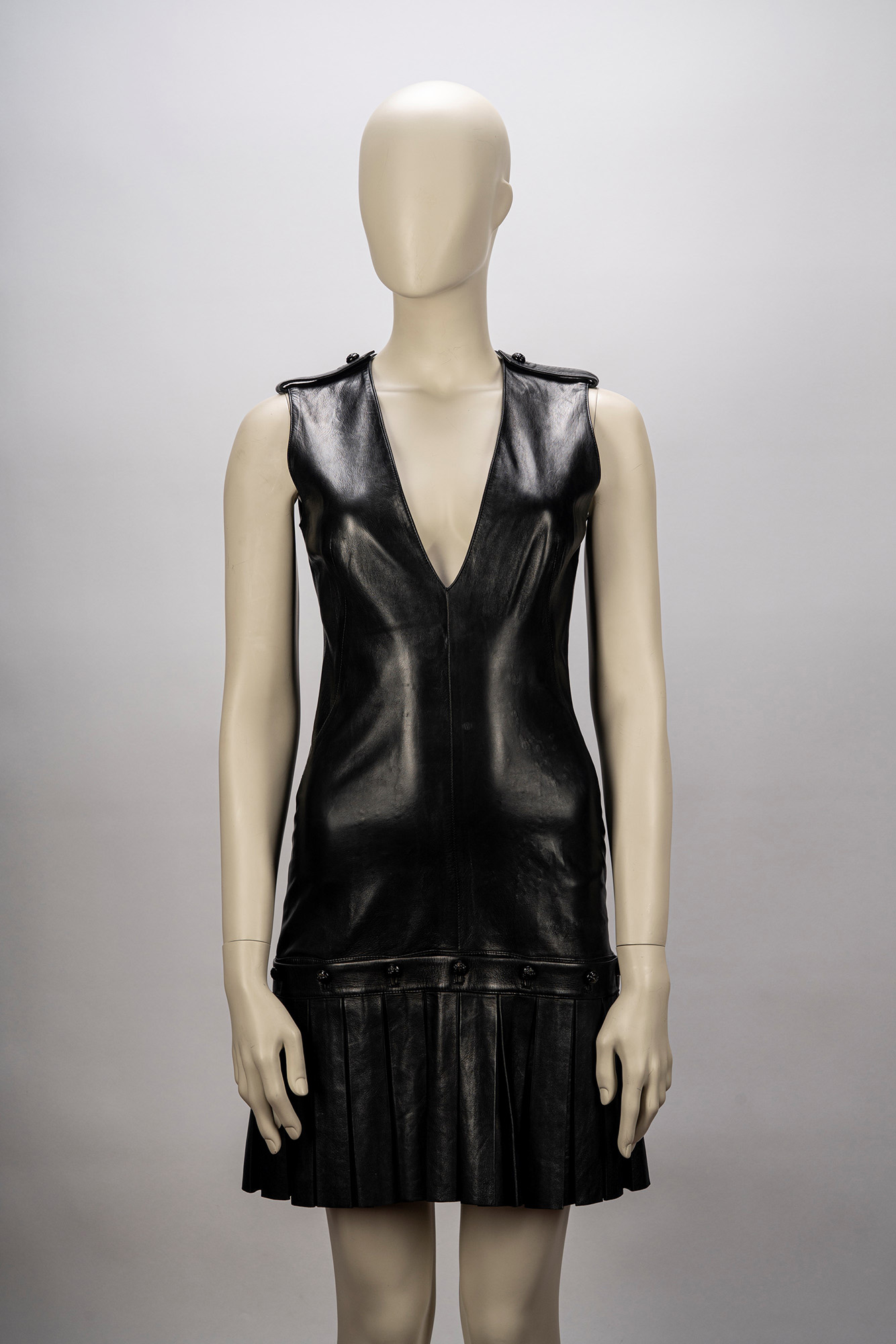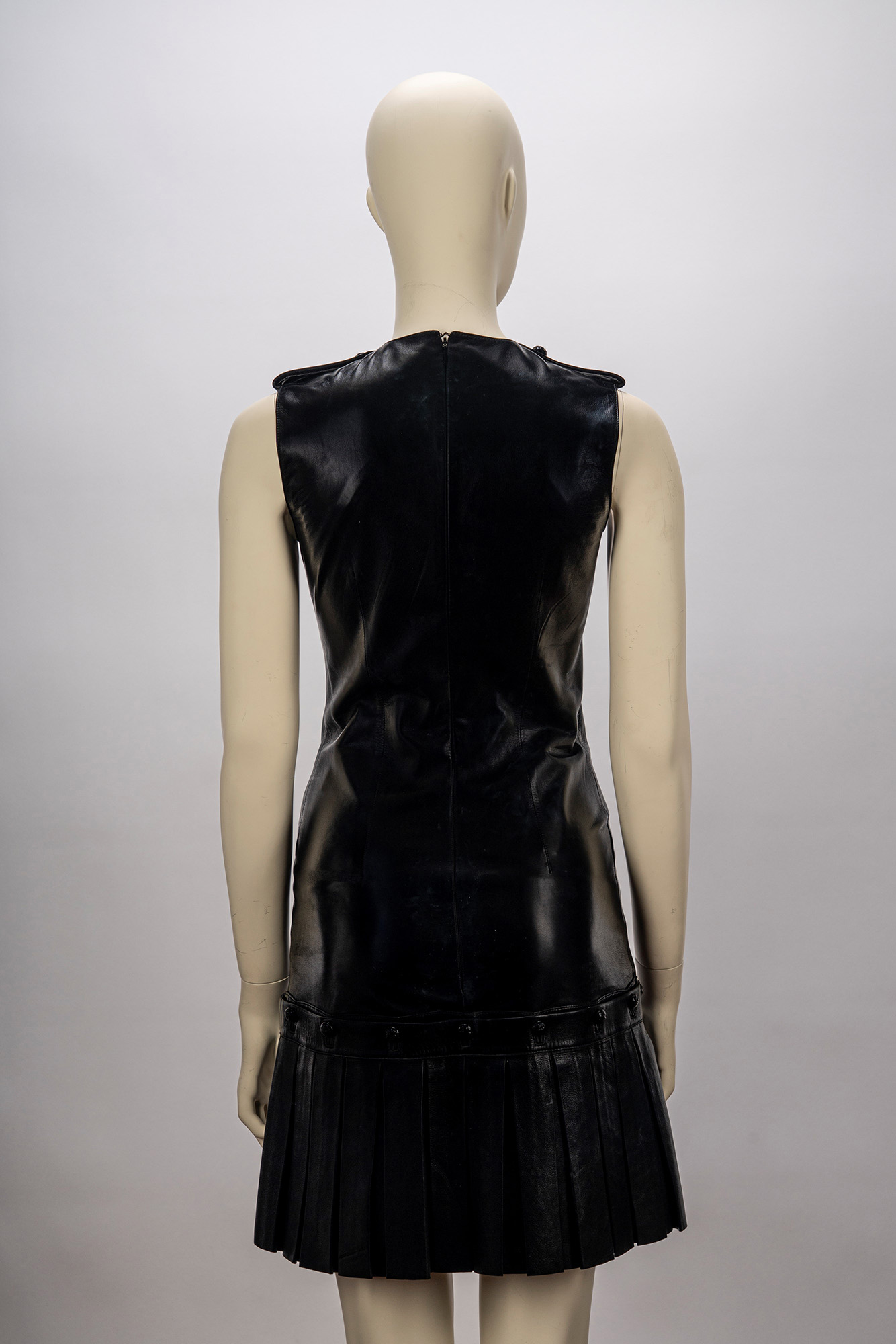 in pelle color nero, smanicato con scollo a V, bordura a pieghe staccabile con bottoni logati, taglia 40 (segni d'uso)in pelle color nero, smanicato con scollo a V, bordura a pieghe staccabile con bottoni logati, taglia 40 (segni d'uso)