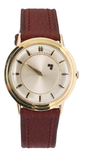 LONGINES Solo tempo in oro giallo "Galaxy" o "Misterioso" anni '50 Diametro 35 mm Per mercato americano, cassa a gradini oro 14 carati. Quadrante con particolare indicazione del tempo, ore su disco centrale con indice applicato e minuti al centro con lancetta. Movimento a carica manuale. An yellow gold only time "Galaxy" or "Misterioso" 50's.