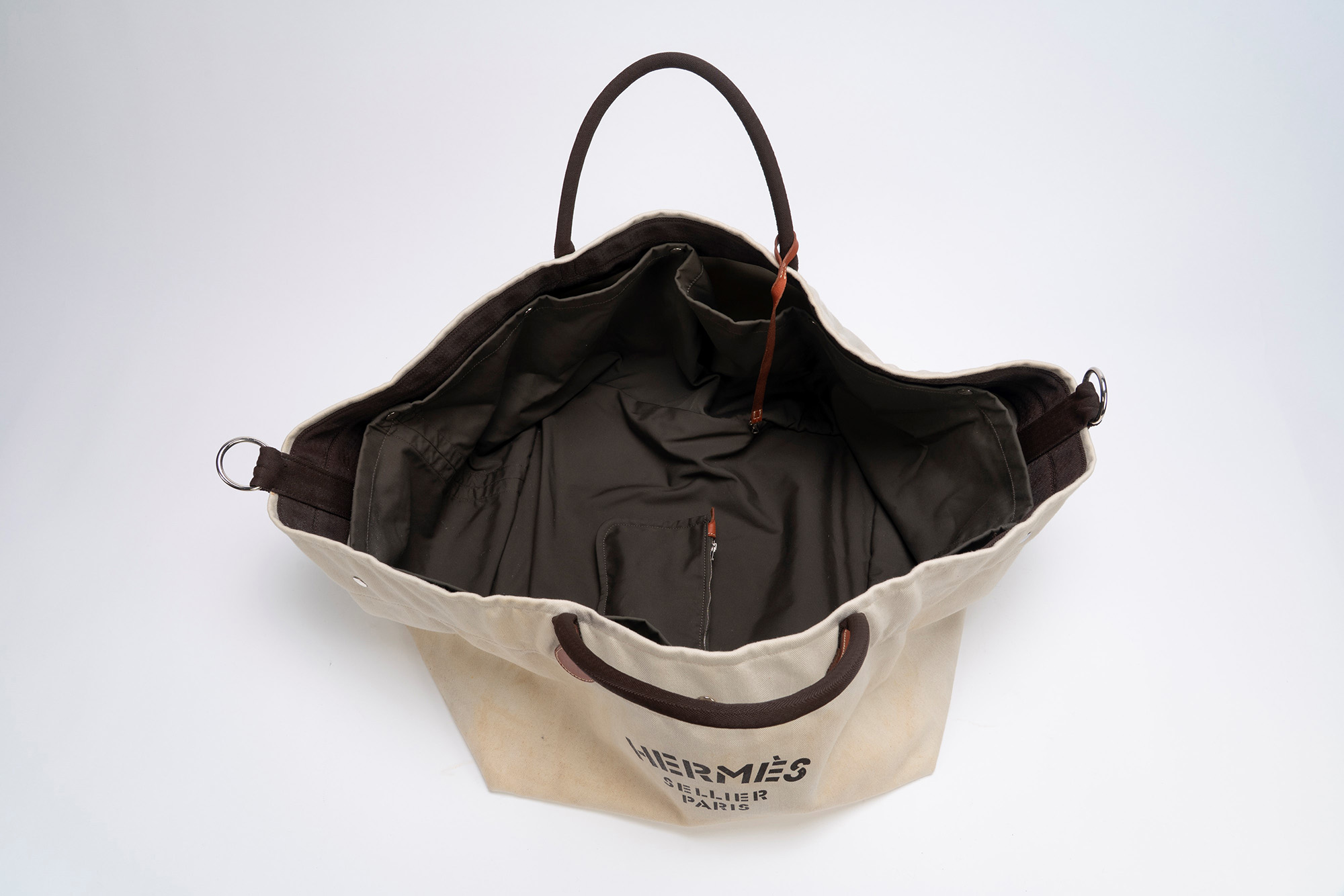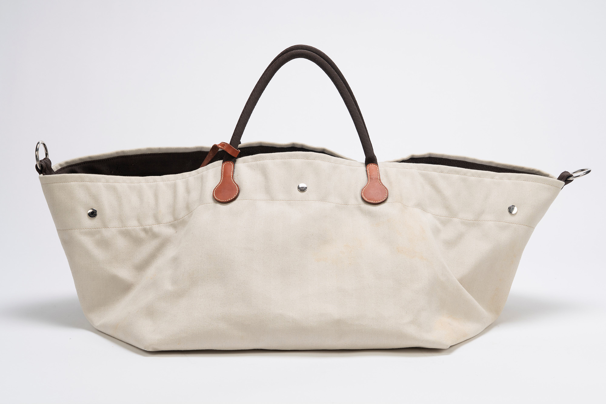in tela Cavalier tinta naturale, doppi manici, fodera interna in tela marrone staccabile, dettagli Clou de selle in palladio, bustina interna, con tracolla staccabile, base cm 45 x 50, apertura cm 90 (importanti segni d'uso)in tela Cavalier tinta naturale, doppi manici, fodera interna in tela marrone staccabile, dettagli Clou de selle in palladio, bustina interna, con tracolla staccabile, base cm 45 x 50, apertura cm 90 (importanti segni d'uso)