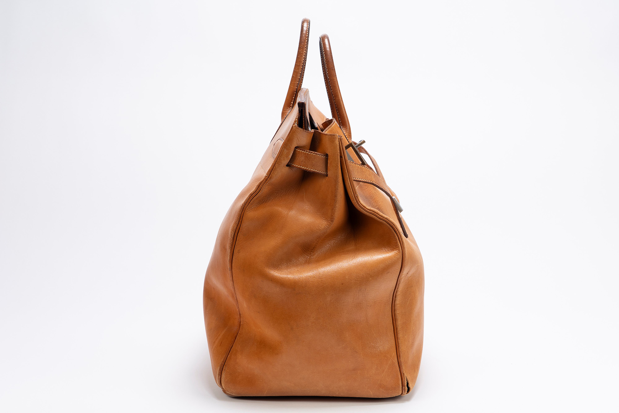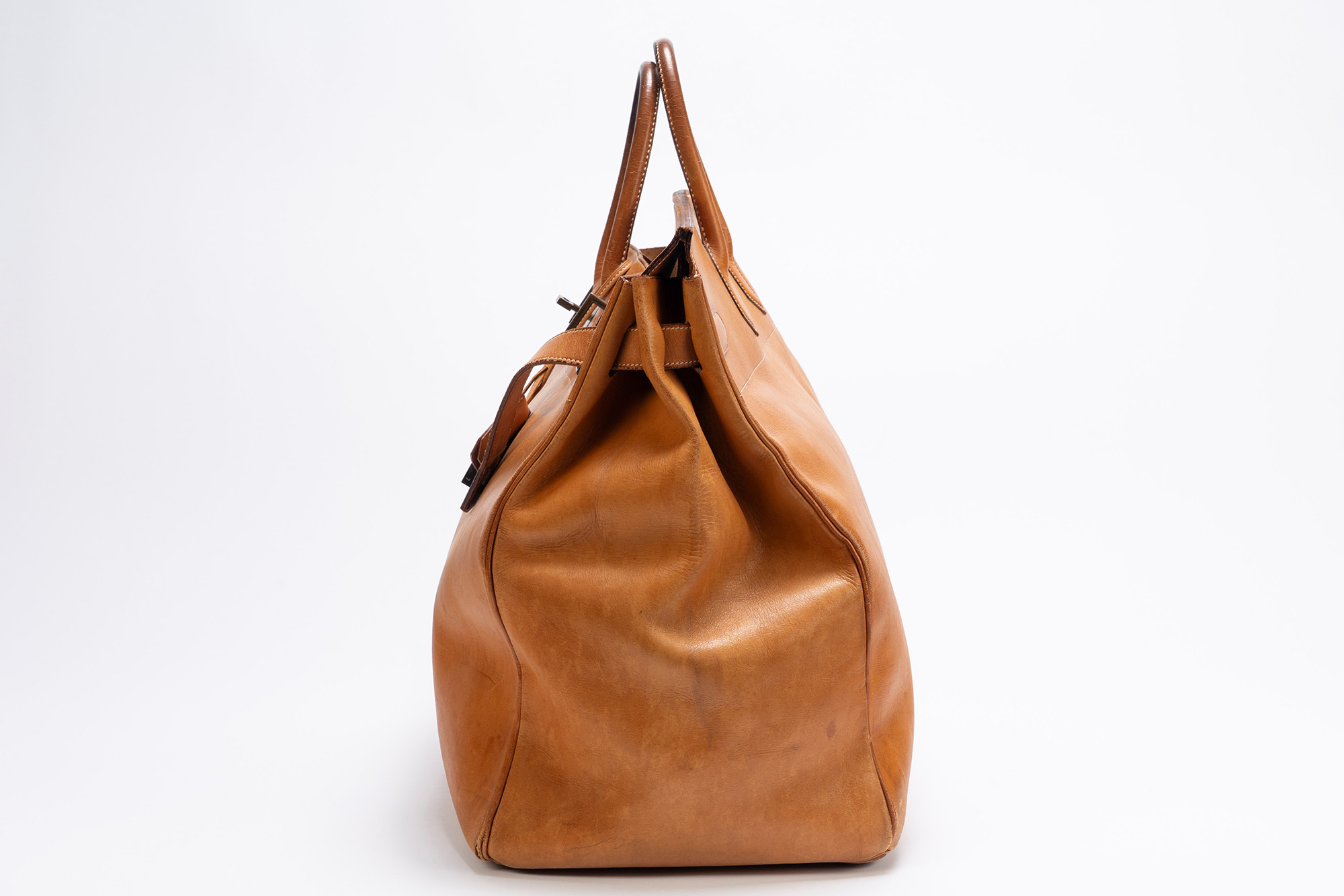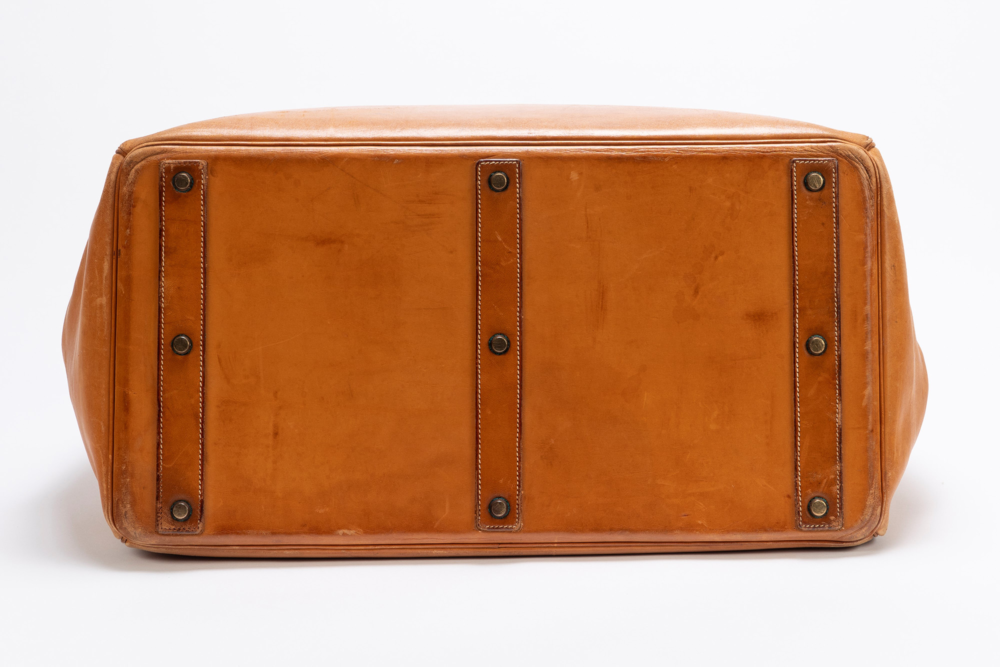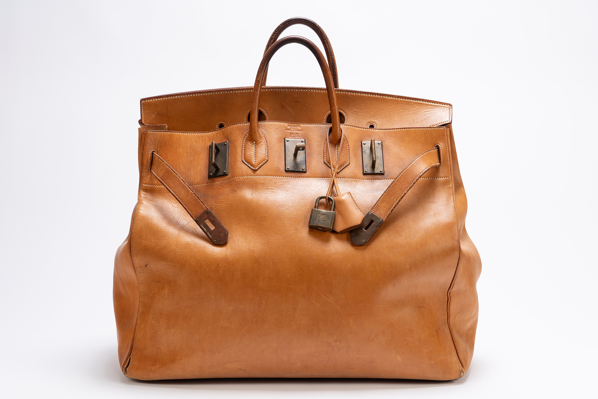 in vache naturel, doppi manici, dettagli in ottone, cm 50, iniziali P.S., con sacchetto (importanti segni d'uso)in vache naturel, doppi manici, dettagli in ottone, cm 50, iniziali P.S., con sacchetto (importanti segni d'uso)