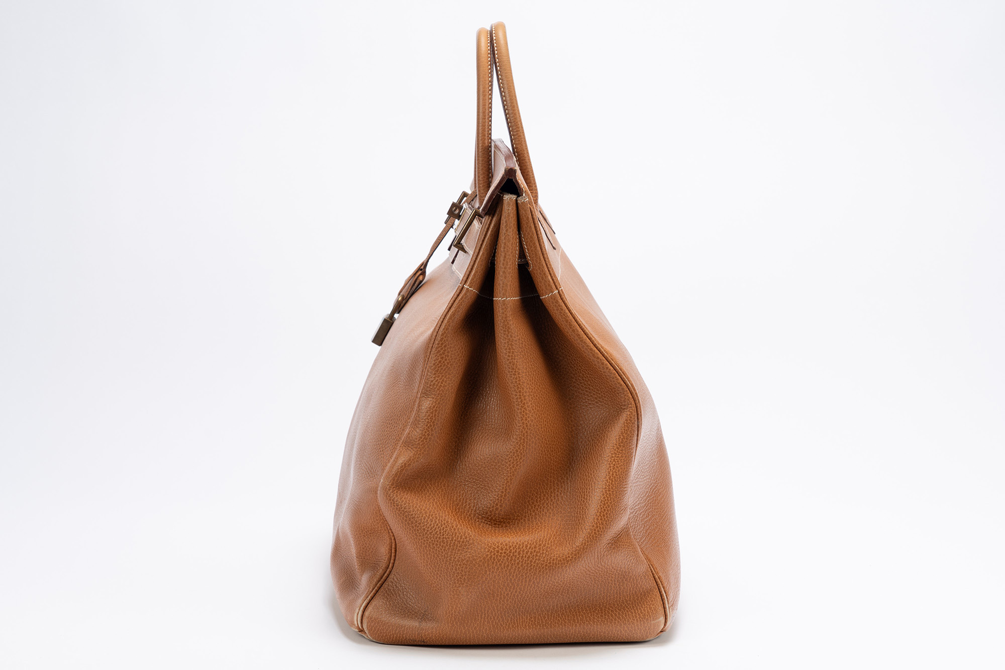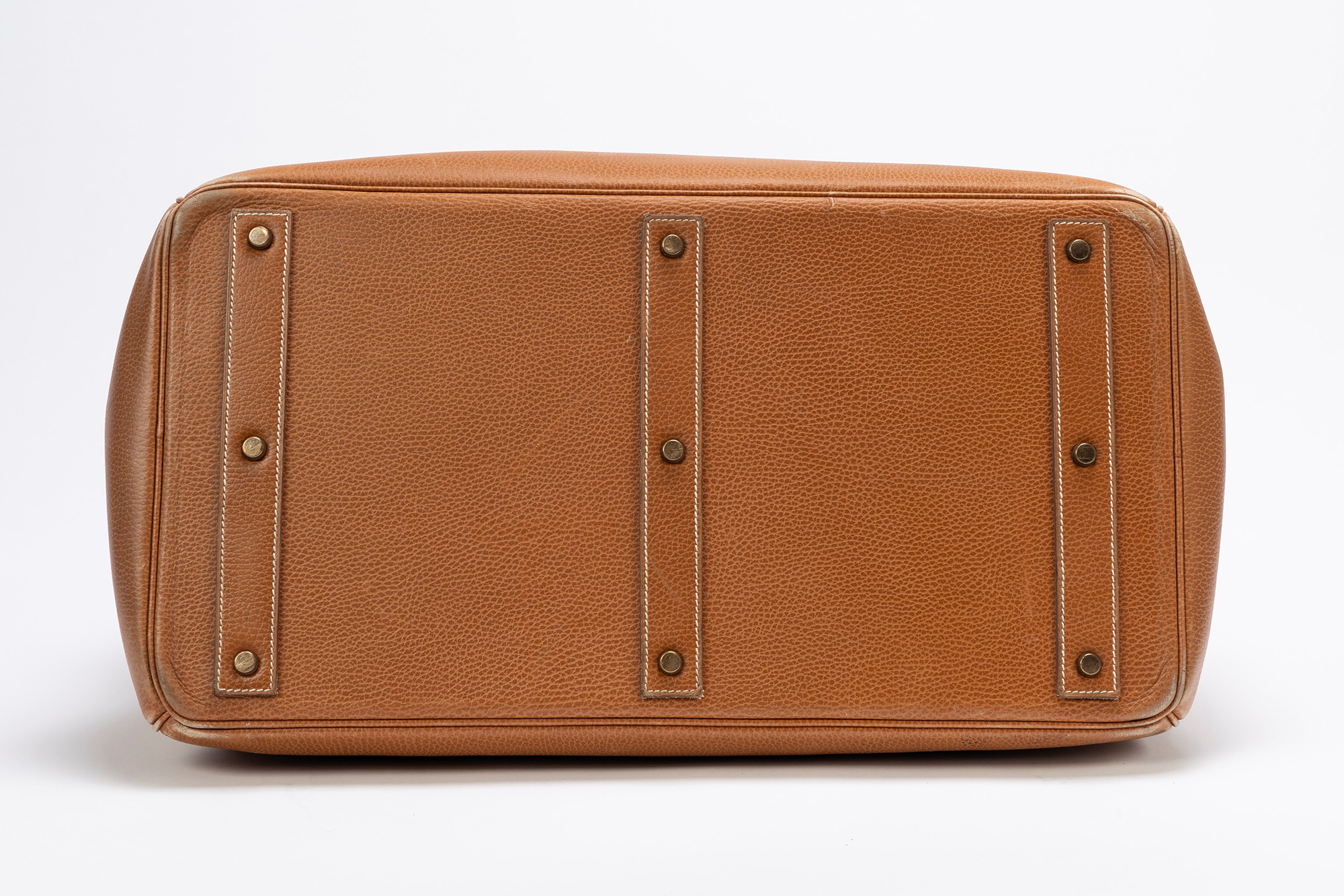 in pelle gold, doppi manici, dettagli in ottone, iniziali P.S., cm 50 (segni d'uso)in pelle gold, doppi manici, dettagli in ottone, iniziali P.S., cm 50 (segni d'uso)