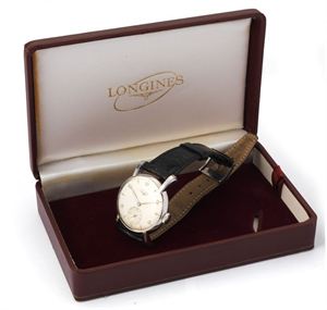 LONGINES Acciaio anse doppie scanalate anni '50 Diam 34 mm Cassa in acciaio con particolari anse doppie scanalate, quadrante con indici e numeri alternati applicati, secondi al sei, movimento a carica manuale. Corredato di astuccio dell'epoca. Double fluted steel handles 50s