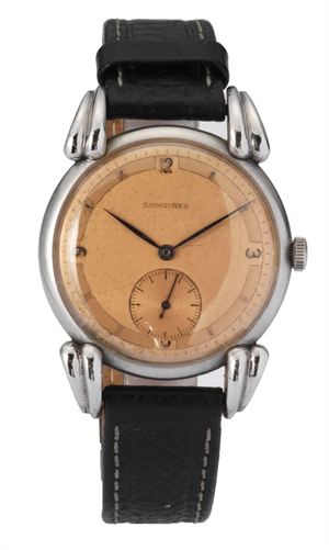 LONGINES Solo tempo anni '40 Diametro 34 mm Cassa in due corpi con particolari anse doppie a rgno scanalate quadrante serigrafto a settori. Movimento a carica manuale. An only time 40's