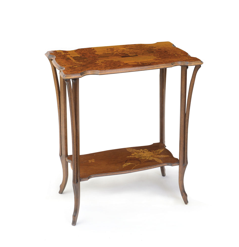 TAVOLO INTARSIATO IN LEGNI VARI, GALLE', 1890 CA., a due ripiani sagomati, decoro a paesaggio marino e farfalla, firma ad intarsio "Gallé".
