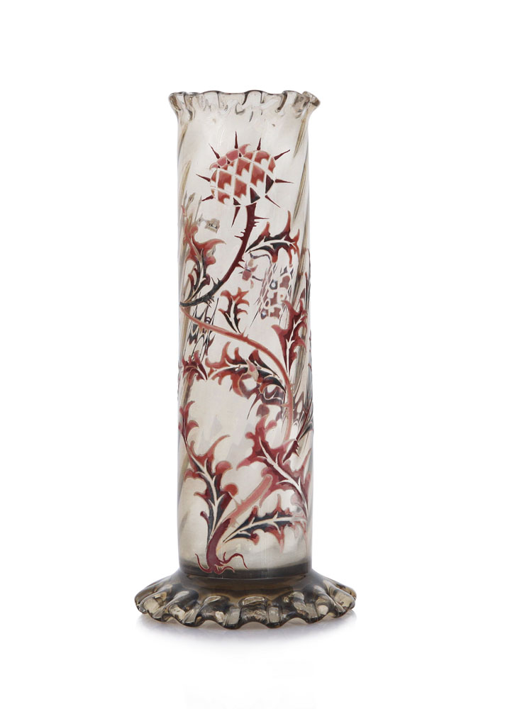 VASO IN CRISTALLO FUME' DECORATO A SMALTI, GALLE', 1890 CA., cilindrico su base e collo ornati a costolature ondulate, decoro a fiori di cardo foglie e croce di Lorena a smalti policromi, firma incisa alla punta "E Gallé Nancy".